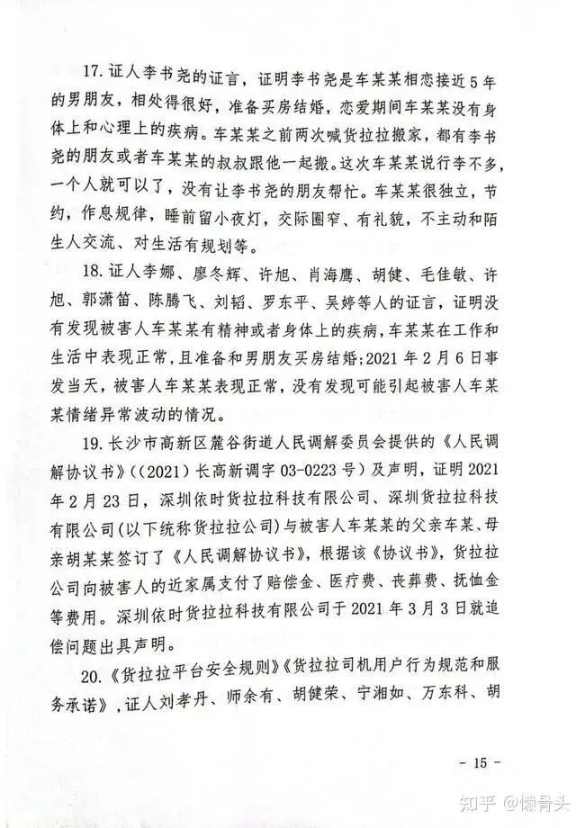 19. 长沙市高新区麓谷街道人民调解委员会提供的《人民调解协议书》((2021)长高新调字03-0223号)及声明,证明2021年2月23日,深圳依时货拉拉科技有限公司、深圳货拉拉科技有限公司(以下统称货拉拉公司)与被害人车某某的父亲车某、母亲胡某某签订了《人民调解协议书》,根据该《协议书》,货拉拉公司向被害人的近家属支付了赔偿金、医疗费、丧葬费、抚恤金等费用。深圳依时货拉拉科技有限公司于2021年3月3日就追偿问题出具声明。