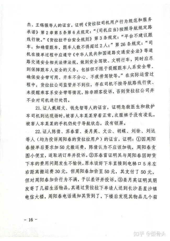 20. 《货拉拉平台安全规则》《货拉拉司机用户行为规范和服务承诺》,证人刘孝丹、师余有、胡健荣、宁湘如、万东科、胡杰、王锡强等人的证言,证明《货拉拉司机用户行为规范和服务承诺》第2章第5条第6点规定:“(司机应当)按照导航线行驶。”《货拉拉平台安全规则》第3条规定:“平台不建议跟车,如确需跟车,跟车人数不得超过2人;”第26条规定“司机在接单过程中应遵守《中华人民共和国道路交通安全法》等道路交通安全相关法律法规,做到安全驾驶、文明行车,同时应尽到保障跟车人安全的义务,包括但不限于提醒跟车人系安全带、确保安全带可用、开车不分心、不疲劳驾驶等。”在实际运营过程中,货拉拉公司监管并不到位,存在司机不按导航路线行使、未提醒乘客系安全带等情况,除非顾客投诉,否则货拉拉公司并不会对司机进行处罚。