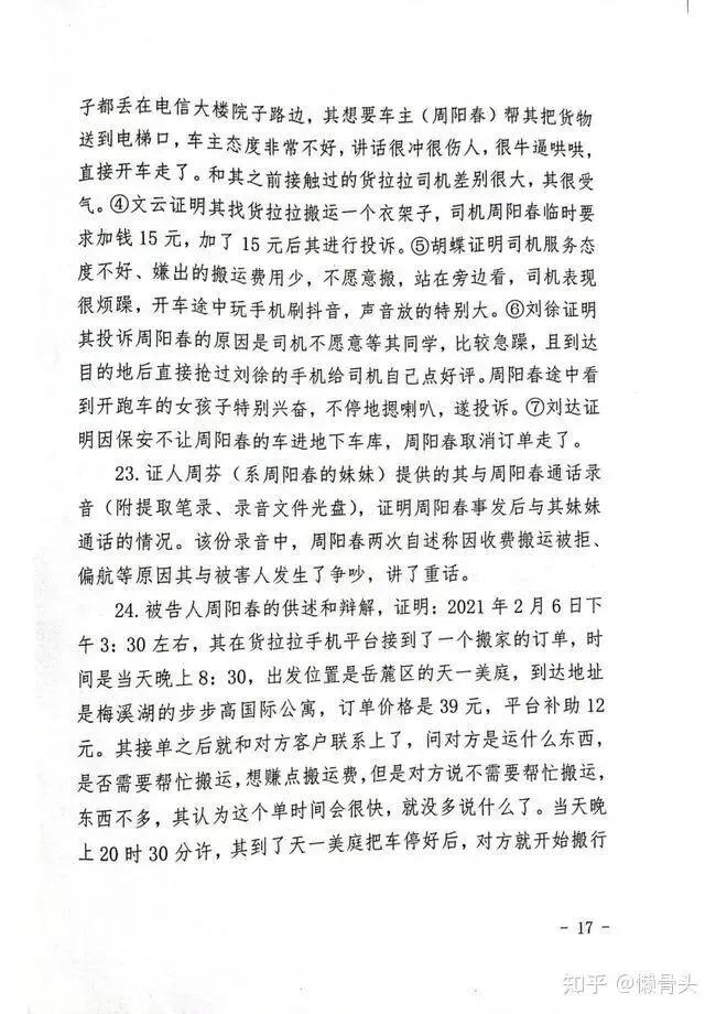 22. 证人陈倩、苏春雷、姜月英、文云、胡蝶、刘徐、刘达等人(均为投诉周阳春的货拉拉用户)的证言,证明:①因周阳春接单后要求加50元搬运费,陈倩认为不应该加钱,周阳春贪图小便宜,遂取消订单并投诉。②苏春雷证明其与周阳春因卸货下车的费用问题发生不愉快,原本谈好下车直接到电梯口5米左右距离搬运费30元,但周阳春加价至50元,其支付了50元,但对周阳春加价行为不满,予以差评并投诉。③姜月英证明其朋友寄了几箱生活物品,其通过货拉拉下单请人送到长沙县星沙镇电信大楼,周阳春电话通知其货到了,下楼后发现其物品几个箱子都丢在电信大楼院子路边,其想要车主(周阳春)帮其把货物送到电梯口,车主态度非常不好,讲话很冲很伤人,很牛逼哄哄,直接开车走了。和其之前接触过的货拉拉司机差别很大,其很受气。④文云证明其找货拉拉搬运一个衣架子,司机周阳春临时要求加钱15元,加了15元后其进行投诉。⑤胡蝶证明司机服务态度不好、嫌出的搬运费用少,不愿意搬,站在旁边看,司机表现很烦躁,开车途中玩手机刷抖音,声音放的特别大。⑥刘徐证明其投诉周阳春的原因是司机不愿意等其同学,比较急躁,且到达目的地后直接抢过刘徐的手机给司机自己点好评。周阳春途中看到开跑车的女孩子特别兴奋,不停地摁喇叭,遂投诉。⑦刘达证明因保安不让周阳春的车进地下车库,周阳春取消订单走了。