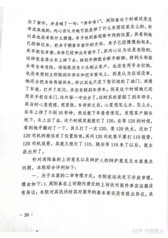 其说完以后,这个妹子又低头看了一眼手机,估计是看到导航又恢复正常了,对其说了句:“不好意思。”其又用不耐烦的口气说了句:“莫名其妙!”说完这句话后车子已经到了林语路与曲苑路拐弯的位置了,其左拐上了曲苑路以后十几米的样子,这个妹子就又说:“师傅,你又偏航了!”,其还是没理会她,认为这个妹子很纠结,不想搭理她。接着没多久,这个妹子又说了一句:“师傅,你偏航了!”这次说话的语气和口气都要重一些,速度快一些,已经是用质问的口气和其说了,从她当时说话的口气可以感受到她有点恐惧和害怕了,但是其还是没回答她,内心还是在想,这个妹子到底是怎么回事,其已经说了不会多收她的钱,她还在讲这些到底什么意思。紧接着,其就看到这个妹子把头伸出了窗外,并且喊了一句:“停车咯!”,周阳春这个时候还是没有考虑其他的,内心自认为她可能是掉了什么东西还是怎么的,所以其也没采取什么措施,车子快到曲苑路中间的位置,其看到她巳经转过身,把身子朝着车窗外的方向,身子已经慢慢抬起来,双手抓住车窗,身体已经伸出车窗外了,其内心认为这无危险的,这样很容易从车上掉下去,摔到手脚就会断手断脚,摔到头部就会有生命危险,但他既没有口头制止客户,也没有用手去拉她,也没有想到立即踩刹车停车和把车窗关上,而是认为应该没事,她还会把身体再缩回来,所以其也只是下意识地松了油门,减慢了车速,打开了双闪,并没有踩刹车停车。但是这个时候她已经用双手抓住车门,往外面一冲出去了。这时其赶紧踩了刹车停车,其当时心里很慌、很紧张,车停好之后,心里想怎么办、怎么办,在车上待了不到10秒钟,然后就下车查看情况,发现客户躺在地下,头上出了血,这个时候其就拨打了120,在等120的时候,看到她手翻动了一下,其又打了一次120,要120快点,还加了120司机的微信发了位置给他,其问120司机要不要打110报警,120司机说要,其就又拨打了110,随后等110来了以后,就去派出所了。
