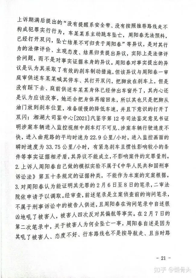 一、关于本案的二审审理方式。本院依法决定不开庭审理。理由如下:1. 周阳春在上诉期内递交的上诉状对案件事实证据没有异议;本院对其讯问时其对案件的基本事实没有提出异议。其提出的“没有提醒系安全带、没有按照推荐路线走不构成犯罪实行行为,车某某系主动跳车坠亡,周阳春无法预料,已经打开双闪,坠亡结果不可归责于周阳春”等异议,是对其行为的法律评价、主观态度、结果归责提出异议,实际上是法律评价问题,而不是对事实证据本身的异议。周阳春对事实提出的异议是认为其采取了有效的刹车制动措施,但该异议与周阳春一审庭审供述车某某喊其停车、其打开双闪,把脚放在刹车上,但是没有踩下去、庭前供述车某某身体已经伸出车窗外了,其内心还是认为应该没事,她还会把身体再缩回来,所以其也只是把脚从油门放到刹车位置,准备缓慢的降低车速,并且下意识的打开了双闪;湘湖大司鉴中心[2021]汽鉴字第12号司法鉴定意见书证明涉案车辆进入监控视频中刹车灯不可见、涉案车辆行驶速度不快,进入曲苑路的平均时速为22.9公里/小时,进入监控画面的瞬时速度为33.75公里/小时,有紧急刹车且惯性影响较小的条件等事实证据相矛盾,其异议不能成立,不影响案件的定罪量刑。2. 上诉人周阳春自己做的模拟实验不属于《中华人民共和国刑事诉讼法》第五十条规定的证据种类,不能作为本案的定案根据。3. 对周阳春认为能证明其无罪的2月6日至8日的笔录,二审法院依申请予以调取。经审查,前述笔录是立案侦查前的询问笔录,不属于刑事诉讼中的被告人供述,且周阳春在询问笔录中自述很凶地吼了被害人,被害人四次反对其偏航等事实。在2月7日的第二次笔录中,关于被害人为何会坠亡一事,周阳春自述是因为其吼了被害人、态度不好、行车路线也不是按导航走、且当时路段人少车少又没有什么路灯,让她产生了周阳春会对她不轨的想法。周阳春自述其之所以在2月7日第一次笔录中没有交代凶了车某某是因为害怕承担刑事责任等内容,反映了周阳春避重就轻、逐步陈述的过程。前述笔录与其侦查阶段供述不矛盾,笔录内谷也不能证明其无罪。4. 因周阳春提交了模拟实验光盘、其辩护人何智娟申请调取了周阳春2021年2月6日至8日的笔录,本院依照《最高人民法院关于适用〈中华人民共和国刑事诉讼法〉的解释》第三百九十五条之规定,通知长沙市人民检察院查阅、复制前述材料,并非因决定开庭审理而通知检察机关阅卷。另外,本案检察机关没有抗诉。综上,本案不属于《中华人民共和国刑事诉讼法》第二百三十四条规定的应当开庭审理的案件,本院依法决定不开庭审理。