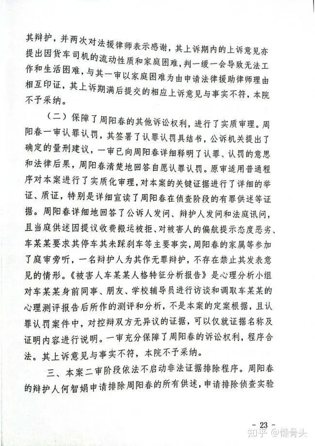 (二)保障了周阳春的其他诉讼权利,进行了实质审理。周阳春一审认罪认罚,其签署了认罪认罚具结书,公诉机关提出了确定的量刑建议,一审已向周阳春详细释明了认罪、认罚的意思和法律后果,周阳春清楚地回答自愿认罪认罚。原审适用普通程序对本案进行了实质化审理,对本案的关键证据进行了详细的举证、质证,特别是详细宣读了周阳春在侦查阶段的有罪供述等证据。周阳春详细地回答了公诉人发问、辩护人发问和法庭讯问,且当庭供述因提议收费撤运被拒、对被害人的偏航提示态度恶劣、车某某要求其停车其未踩刹车等主要事实,周阳春的家属等参加了庭审旁听,一名辩护人为其作无罪辩护,不存在禁止其发表意见的情形。《被害人车某某人格特征分析报告》是心理分析小组对车某某身前同事、朋友、学校辅导员进行访谈和调取车某某的心理测评报告后所作的测评和分析,不是本案的定案根据,且认罪认罚案件中,对控辩双方无异议的证据,可以仅就证据名称及证明内容进行说明。一审充分保障了周阳春的诉讼权利,程序合法。其上诉意见与事实不符,本院不予采纳。