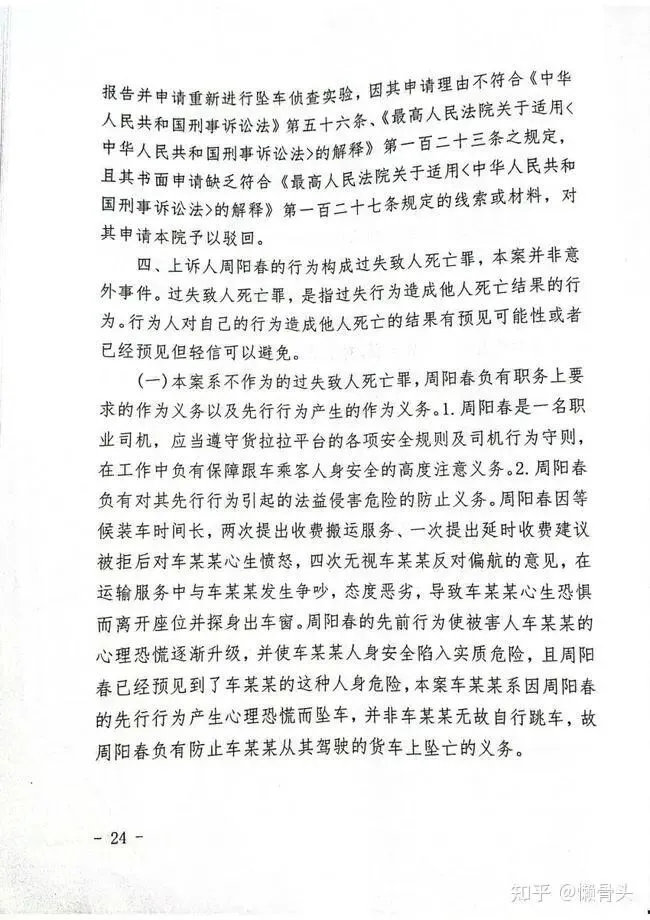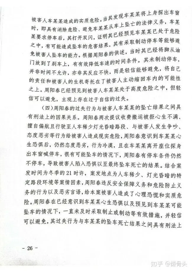 (四)周阳春的过失行为与被害人车某某的坠亡结果之间具有刑法上的因果关系。周阳春两次提议收费搬运被拒心生不满、擅自偏航且行驶至人车稀少灯光昏暗路段、与被害人发生争吵、态度恶劣等行为给被害人造成现实危险,周阳春意识到车某某心生恐惧后,仍然态度恶劣,行为冷漠,且在车某某离开座位探身出车窗喊停车,很有可能坠车的情况下,周阳春有停车条件仍然不停车,导致被害人陷入恐惧以至最终坠车死亡的结果。结合案发时间为冬季的21时许,案发地点为人车稀少、灯光昏暗的特定路段环境等案情因素,周阳春违反安全保障义务和危险防止义务的行为以及恶劣言语,给本案被害人造成了心理恐慌和实质危险。周阳春在已经意识到车某某心生恐惧以及预见到车某某可能坠车的情况下,一直未及时采取制止或制动等有效措施,并轻信可以避免,其过失行为与车某某的坠车死亡结果之间具有刑法上的因果关系。对上诉人周阳春及其辩护人提出本案系意外事件,周阳春无法预料,不存在过失,结果不可归责于周阳春,应改判无罪的上诉、辩护意见本院均不予采纳。