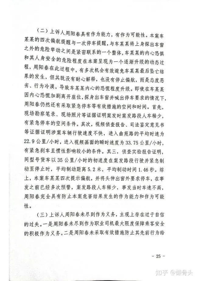 (二)上诉人周阳春具有作为能力,有作为可能性。本案车某某的四次偏航提醒与一次停车提醒,与车某某将上身探出车窗之外的危险举动之间是紧密联系的一个整体,车某某的内心恐惧和其人身安全的危险程度在本案呈现为一个逐渐升级的动态过程,周阳春在此过程中,有多次机会有效避免车某某最后坠亡结果的发生,但其既没有耐心解释,也没有停止偏航,而是态度恶劣、行为冷漠,导致车某某内心的恐慌程度升级。即使在车某某因内心恐慌加剧离开座位,探身出车窗并喊出停车要求的情况下,周阳春仍然还有采取紧急停车等有效措施的空间和时间。首先,现场勘察笔录、现场照片等证据证明案发时案发路段人车稀少,有紧急停车的空间条件。其次,视频侦查报告、司法鉴定意见书等证据证明涉案车辆行驶速度不快,进入曲苑路的平均时速为22.9公里/小时,进入视频画面的瞬时速度为33.75公里/小时,有紧急刹车且惯性影响较小的条件。其三,侦查实验报告证明,同型号货车以35公里/小时的初速度在案发路段行驶并紧急制动至停止时,平均制动距离5.2米,平均制动时间1.46秒。综上,本案车某某四次提示偏航,并将头伸出窗外要求停车,在事发之前已经多次预警,案发路段人车稀少,事发当时车速不高,周阳春完全具有防止本案危害结果发生的作为能力和作为可能牲。
