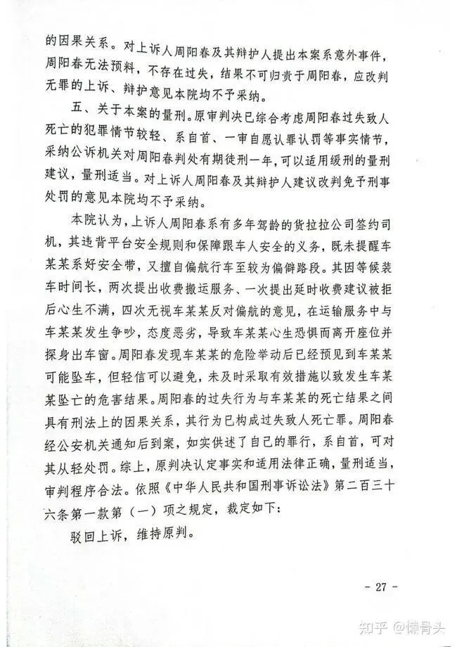 本院认为,上诉人周阳春系有多年驾龄的货拉拉公司签约司机,其违背平台安全规则和保障跟车人安全的义务,既未提醒车某某系好安全带,又擅自偏航行车至较为偏僻路段。其因等候装车时间长,两次提出收费搬运服务、一次提出延时收费建议被拒后心生不满,四次无视车某某反对偏航的意见,在运输服务中与车某某发生争吵,态度恶劣,导致车某某心生恐惧而离开座位并探身出车窗。周阳春发现车某某的危险举动后已经预见到车某某可能坠车,但轻信可以避免,未及时采取有效措施以致发生车某某坠亡的危害结果。周阳春的过失行为与车某某的死亡结果之间具有刑法上的因果关系,其行为已构成过失致人死亡罪。周阳春经公安机关通知后到案,如实供述了自己的罪行,系自首,可对其从轻处罚。综上,原判决认定事实和适用法律正确,量刑适当,审判程序合法。依照《中华人民共和国刑事诉讼法》第二百三十六条第一款第(一)项之规定,裁定如下: