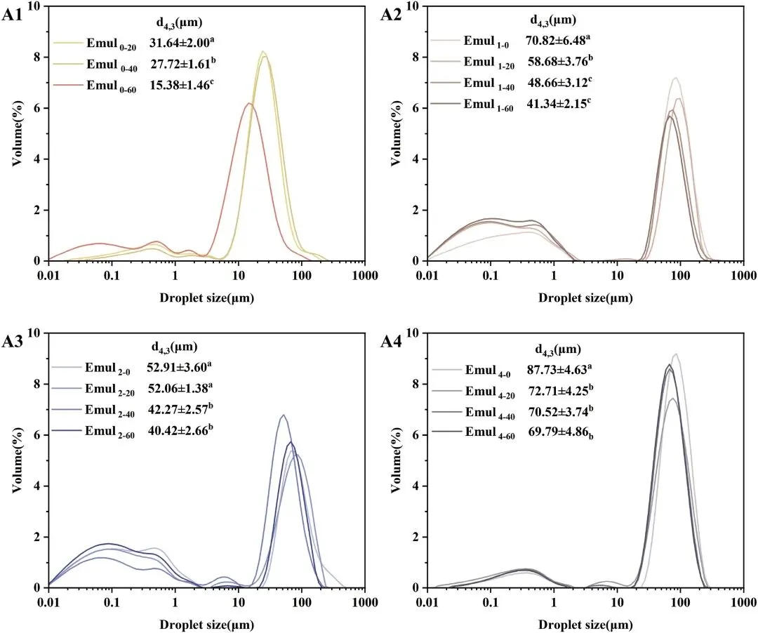 图4 酶水解时间(0、1、2 和 4 小时)及均质化压力(0、20、40 和 60 MPa)对 IPF 基乳液的液滴粒径分布和体积加权平均直径(d4,3)的影响。乳液在以下条件下制备:乳液质量分数 w = 0.4 wt%,乳化比 Φ = 0.1。