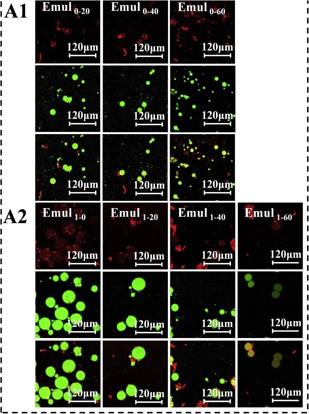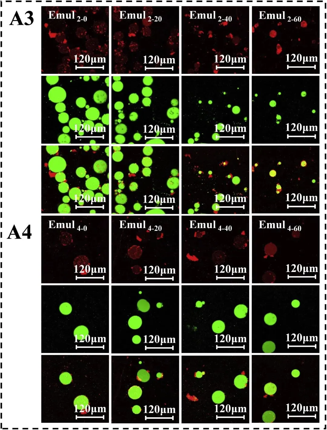 图5通过共聚焦激光扫描显微镜观察,酶水解时间(0、1、2 和 4 小时)及均质化压力(0、20、40 和 60 MPa)对乳液微结构的影响。乳液制备条件如下:乳液质量分数 w = 0.4%,体积分数 Φ = 0.1%。右下角的刻度尺表示120 μm。IPF图像(红色)是在355 nm激发波长下获得的;大豆油图像(绿色)是在488 nm激发波长下获得的;黑色区域为未染色的水相,复合图像为三者的叠加。