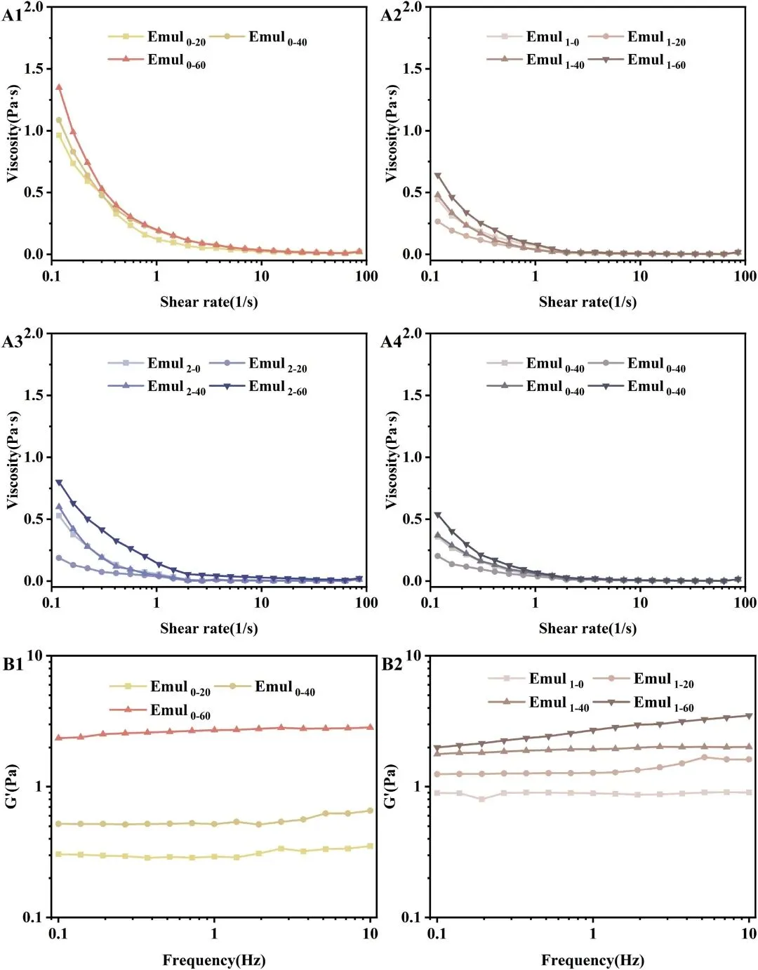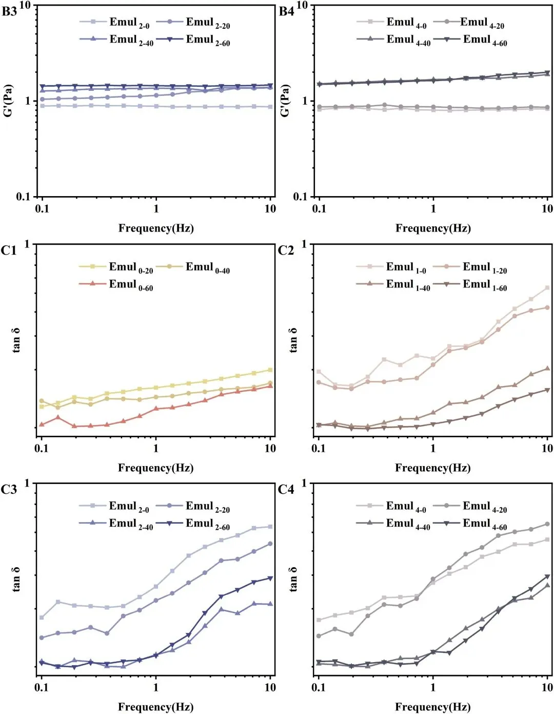 图6 表观粘度(A1、A2、A3 和 A4)、储能模量(G′、B1、 B2、B3 和 B4)以及 tan δ(C1、C2、C3 和 C4),这些数据来自在不同酶水解时间(0、1、2 和 4 小时)和均质化压力(0、20、40 和 60 MPa)下制备的乳液的频率扫描。乳液的制备条件如下:乳液质量分数 w = 0.4%,体积分数 Φ = 0.1。