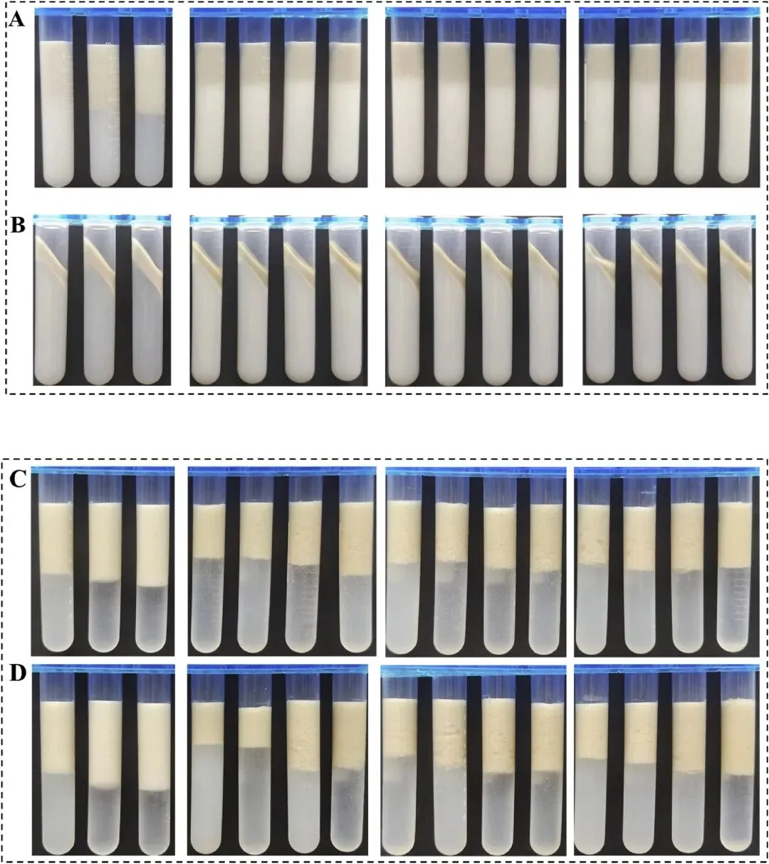 图7 酶水解时间(0、1、2 和 4 小时)及均质化压力(0、20、40 和 60 MPa)对新鲜乳液(A)、5000g 离心后的乳液(B)、含 1000 mM NaCl 的乳液(C)以及 pH 2 (D)的乳液外观。乳液制备条件如下:质量分数 w = 0.4%,体积分数 Φ = 0.1%。试管从左至右依次为:Emul0-20、Emul0-40、Emul 0-60、Emul 1-0、Emul 1-20、 Emul 1-40、Emul 1-60、Emul 2-0、Emul 2-20、Emul 2-40、Emul 2-60、Emul 4-0、Emul 4-20、Emul 4-40 及 Emul 4-60。
