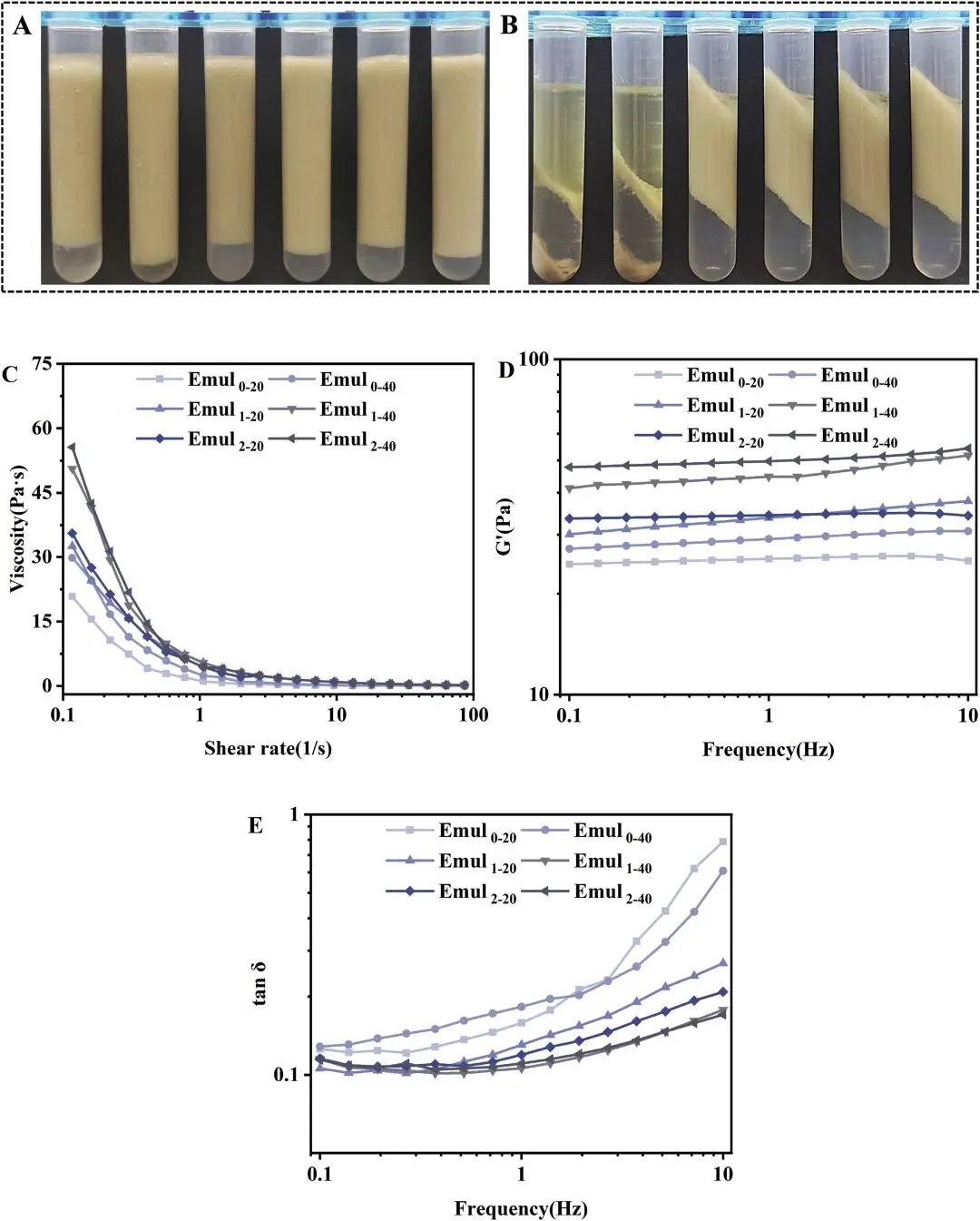 图8 酶水解时间(0、1 和 2 小时)及均质化压力(20、40 MPa)对新鲜乳液外观(A)、经 5000g 离心后的乳液外观(B)、表观粘度(C)、储能模量 G′(D)以及通过频率扫描测得的 tan δ(E)的影响。乳液制备条件如下:乳液质量分数 w = 2%,粒径分布 Φ = 0.4。试管从左至右依次为:Emul 0-20、Emul 0-40、Emul 1-20、Emul 1-40、Emul 2-20 和 Emul 2-40。