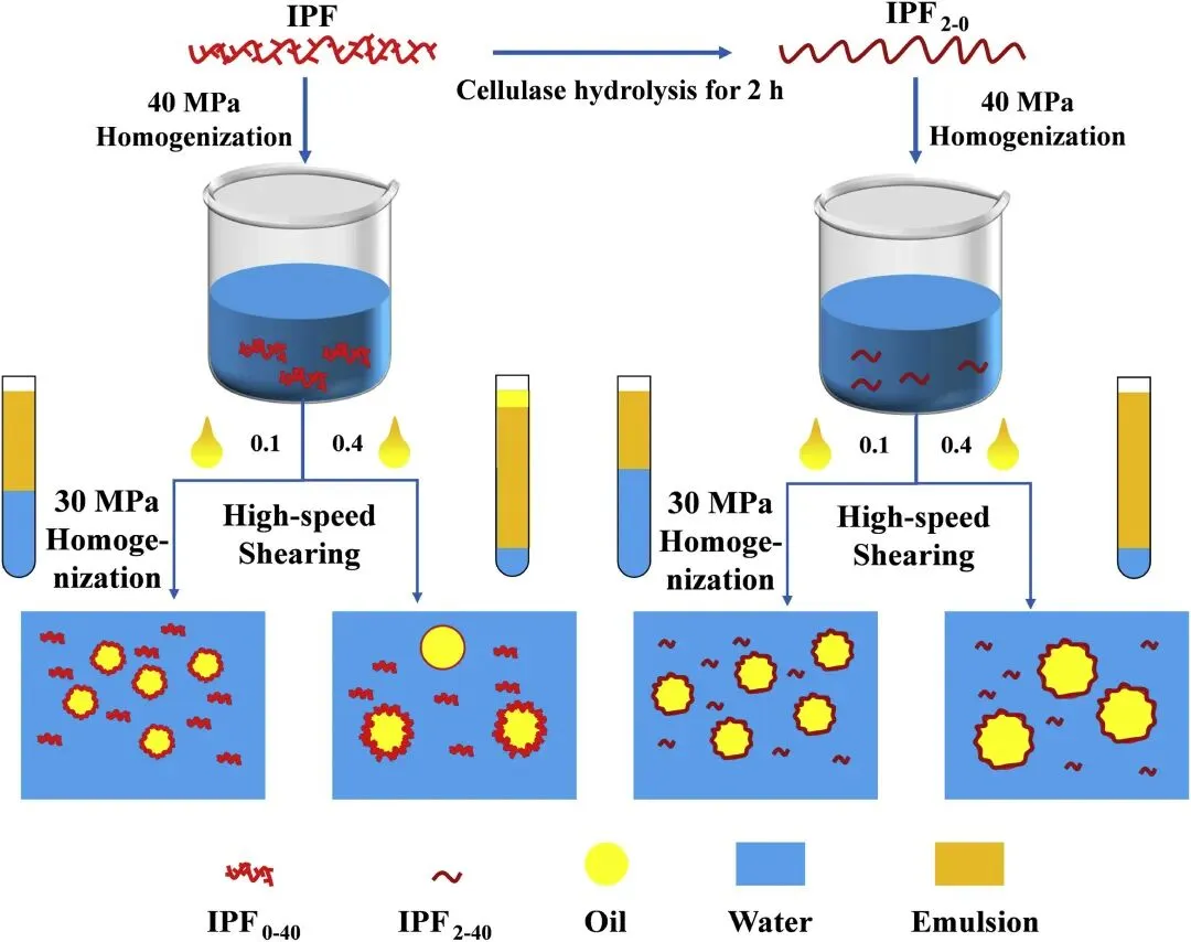 ★本研究表明,IPF 是一种极具前景的绿色食品添加剂和乳化剂。实验制备的 IPF 显示出其结构、理化性质与乳化性能之间存在明确的关联。未水解的 IPF 具有丰富的支链和较强的亲水亲脂性(WHC),通过空间位阻效应形成了更稳定的低油相(Φ = 0.1)乳液。均质化处理进一步减小了液滴尺寸,在60 MPa压力下实现了15.38 μm的最小d4,3值。纤维素酶水解在 IPF 中引入了孔隙,随后的均质化处理提高了其电负性(从 −17.07 到 −28.63 mV),从而通过协同的静电-空间机制稳定了中油相乳液(Φ = 0.4)。相反,未经水解的 IPF 仅靠剪切力无法稳定 Φ = 0.4 的乳液,而经酶水解和均质化的 IPF 却做到了这一点。这很可能是因为未水解 IPF 中过多的支链限制了通过剪切形成致密网络所需的完全界面吸附,而水解后的多孔结构则能稳定更大的油滴。这些发现将农业废弃物的增值利用与乳化技术联系起来,并展示了 IPF 在食品工业中的潜力。