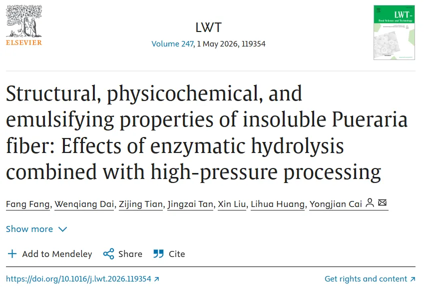 近日,长沙理工大学的研究团队在食品权威期刊LWT(IF=6.6)发表题为Structural, physicochemical, and emulsifying properties of insoluble Pueraria fiber: Effects of enzymatic hydrolysis combined with high-pressure processing的研究性论文。该论文由长沙理工大学食品与生物工程学院蔡勇建副教授为该论文的通讯作者。
