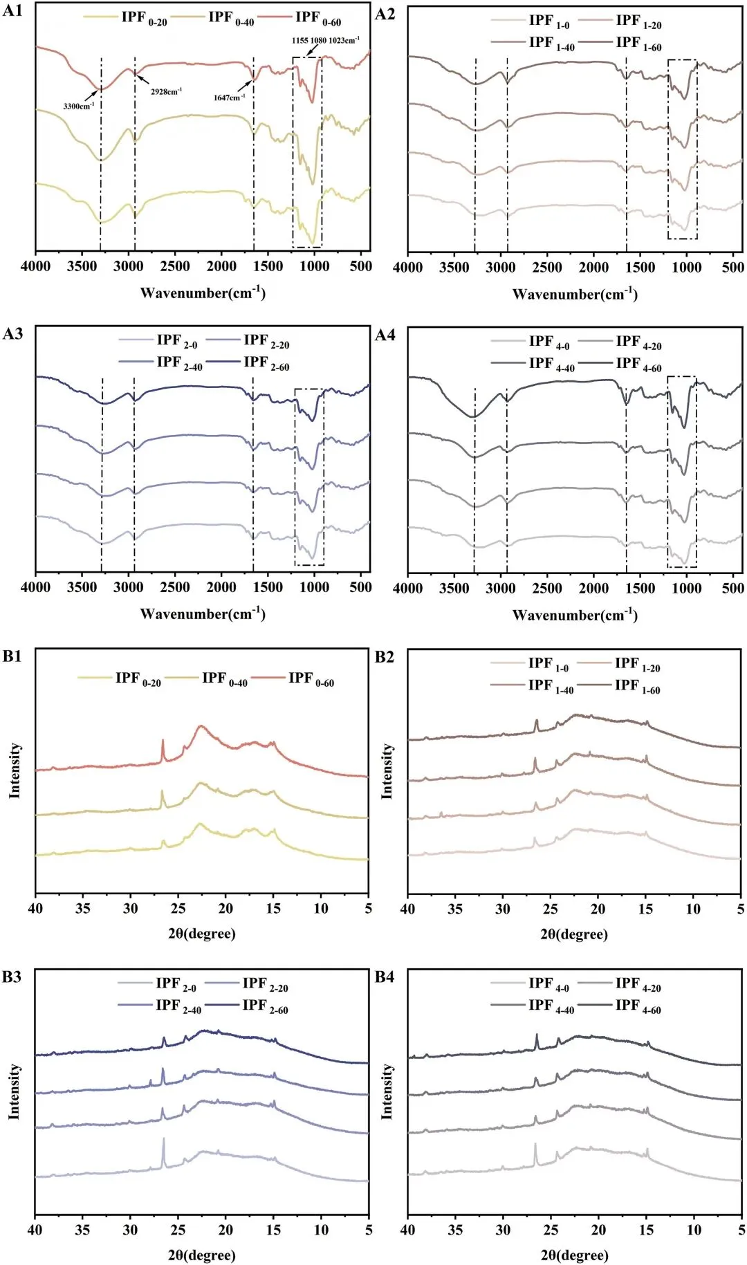 图1 不同酶水解时间(0、1、2和4 小时)和均质化压力(0、20、40和60 MPa)下IPF的FTIR谱图(A)和XRD曲线(B)。