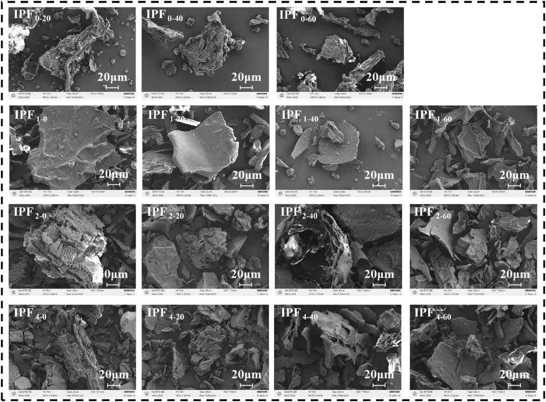 图2在不同酶水解时间(0、1、2 和 4 小时)和均质化压力(0、20、40 和 60 MPa)条件下 IPF 的扫描电子显微镜图像。