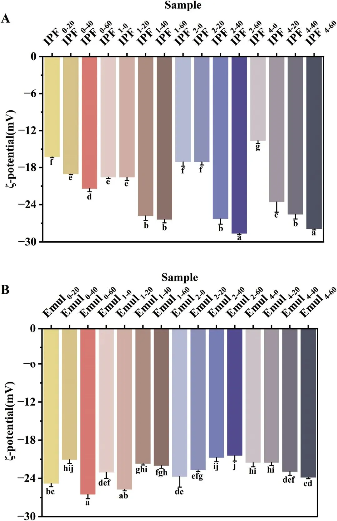 图3酶水解时间(0、1、2 和 4 小时)及均质化压力(0、20、40 和 60 MPa)对 IPF(A)及 IPF 基乳液(B)ζ电位的影响。乳液制备条件如下:乳液质量分数 w = 0.4%,乳化比 Φ = 0.1。