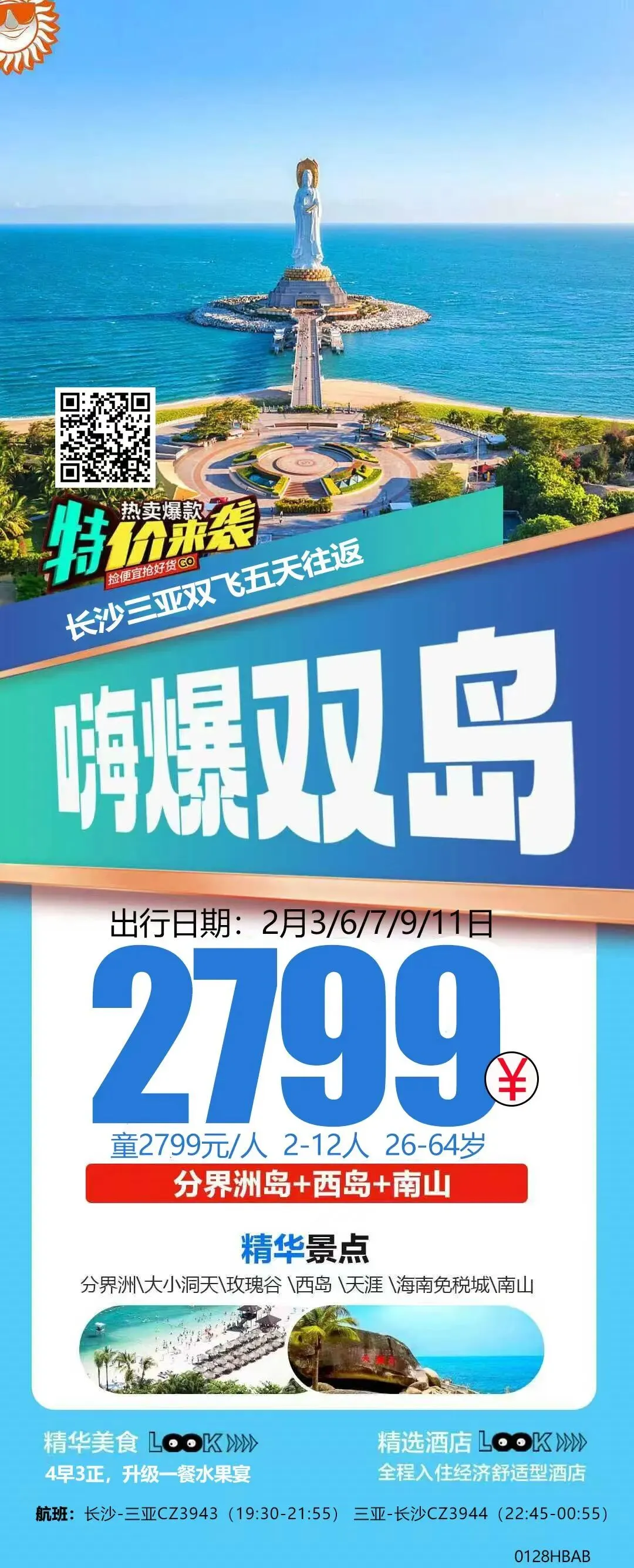 【乐游|海南】嗨爆双岛:长沙直飞三亚5日游,长沙起止2799+130元(2月初版)