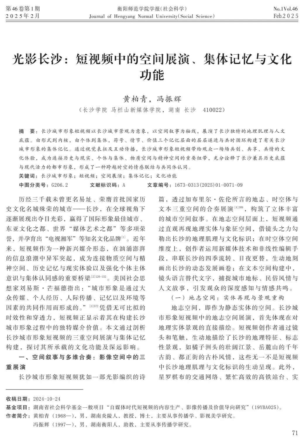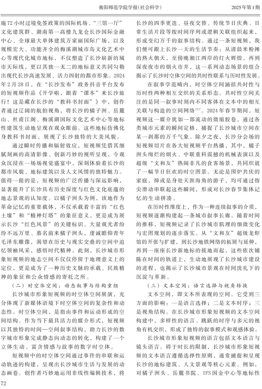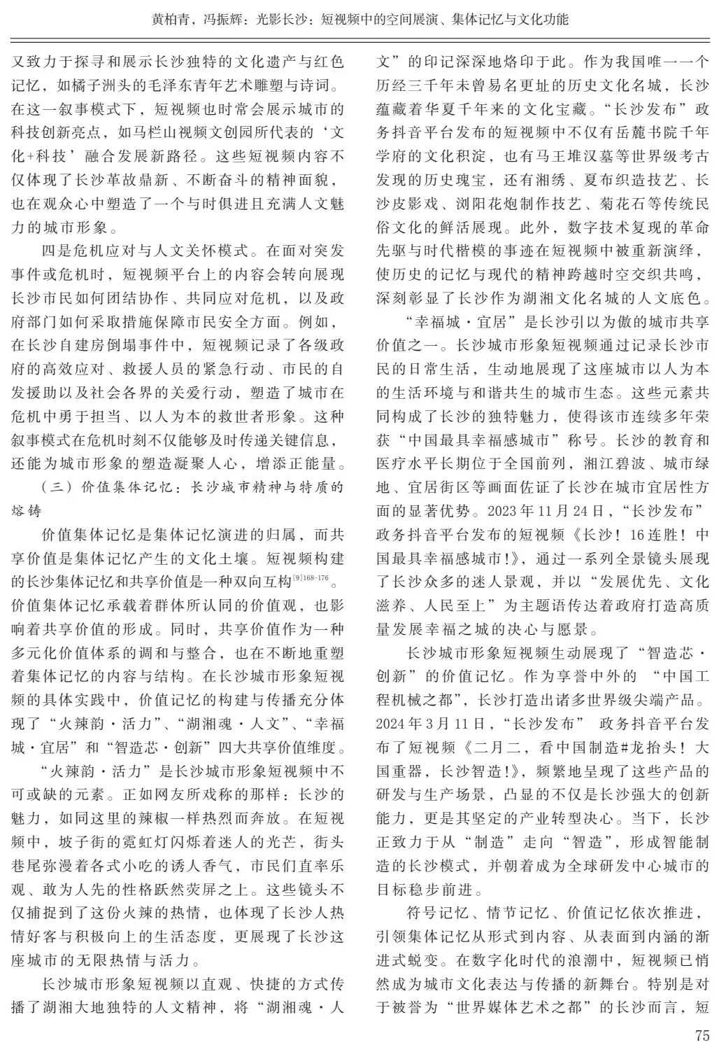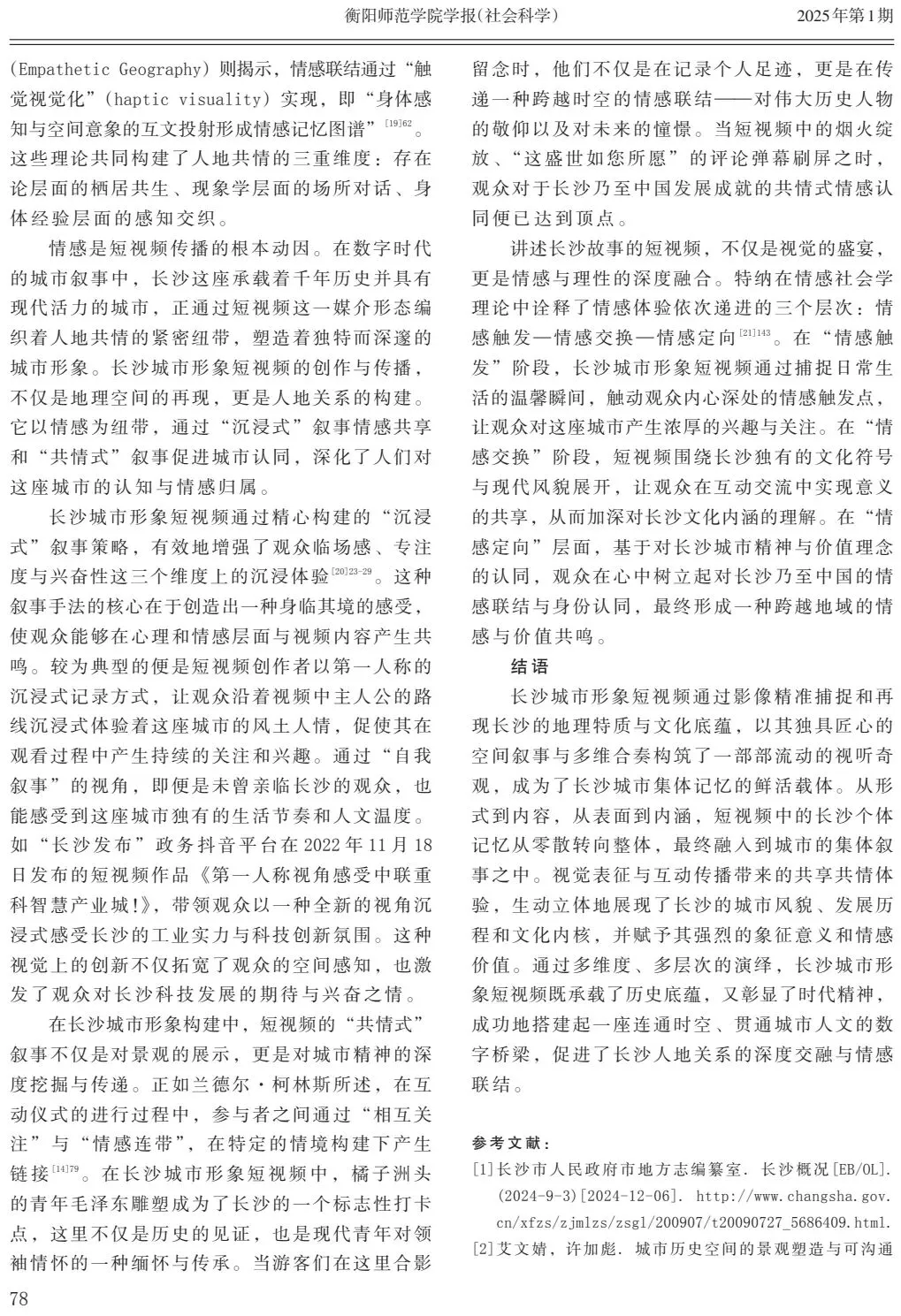关键词:长沙城市形象;短视频;空间展演;集体记忆;文化功能