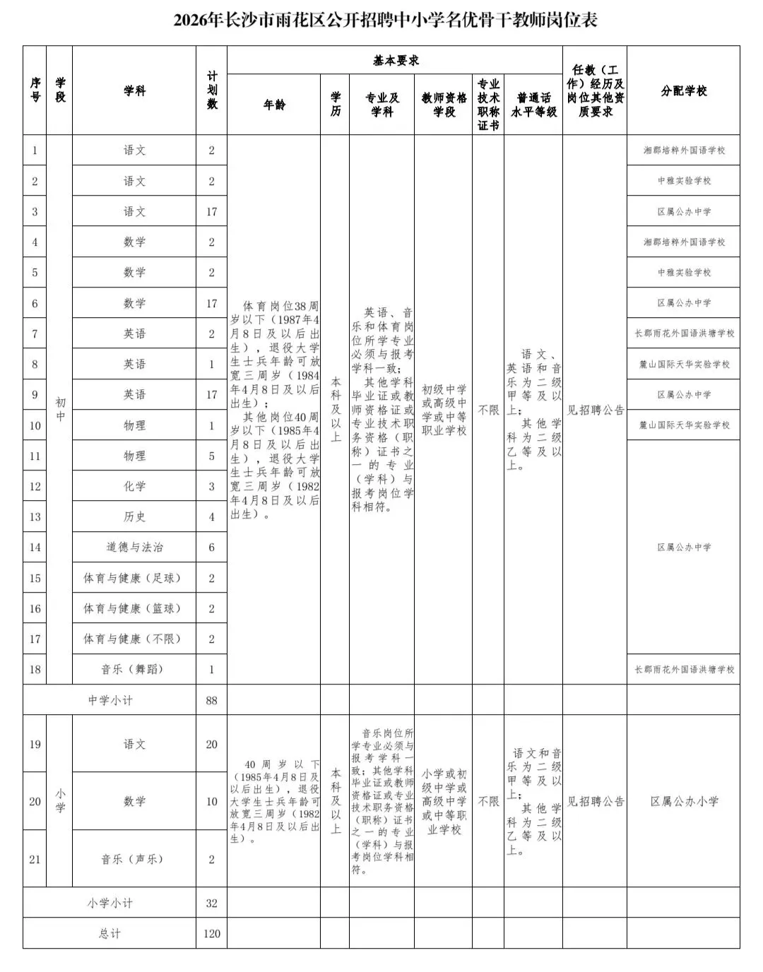 本次公开招聘中小学名优骨干教师岗位21个、招聘计划120名。