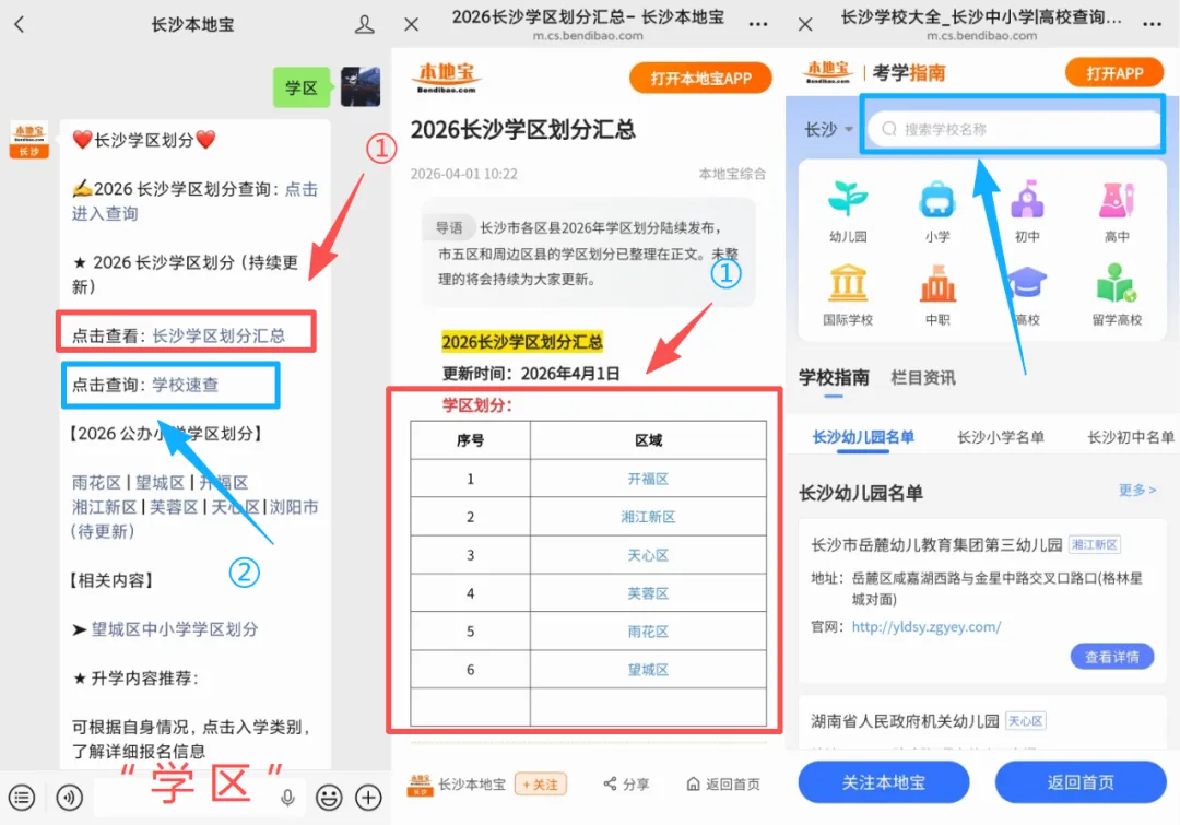 各区学区划分情况、学校快查入口等,大家可以长按下方二维码,跳转进入【长沙本地宝】,后台聊天框发送【学区】,点击【学区划分查询】,即可看到各区的学区划分,点击【学校速查】,即可看到学校所属学区及学校简要介绍。(本地宝仅提供查询,一切以官方详情为准)
