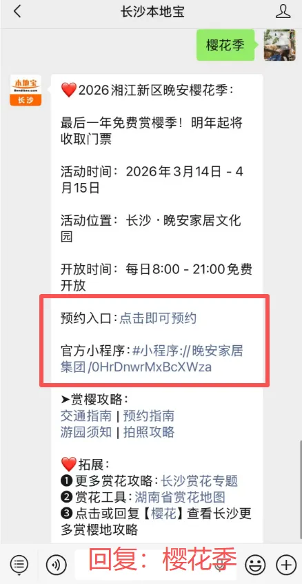 方式二:在【长沙本地宝】后台回复关键词【樱花季】即可直接获得预约入口