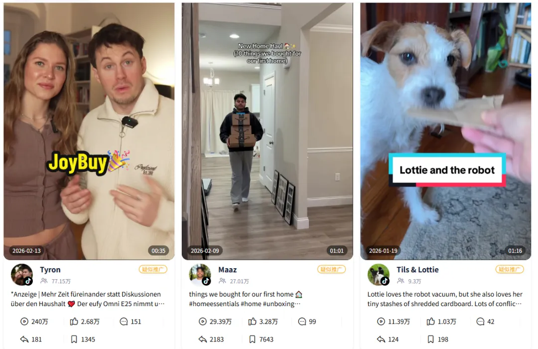 Tyron夫妻档:以「减少家务争吵,增加相处时间」为情感切入点,把 Eufy Omni E25 扫地机包装成「家庭矛盾解决方案」,用情感共鸣打动用户,而非推销产品;Maaz新房开箱:把扫地机作为「新家必备 10 件好物」之一,融入开箱、采购的日常流程,让产品成为「品质生活的标配」,降低用户抵触感;Tils & Lottie宠物档:用「狗狗和扫地机的趣味冲突」做内容钩子,在宠物日常中自然展示产品的清洁能力,用趣味内容种草,让用户在笑声中记住产品。Eufy很清楚,消费者购买的从来不是产品本身,而是产品所带来的更优质的生活体验,其将这一核心准则贯彻到了极致。