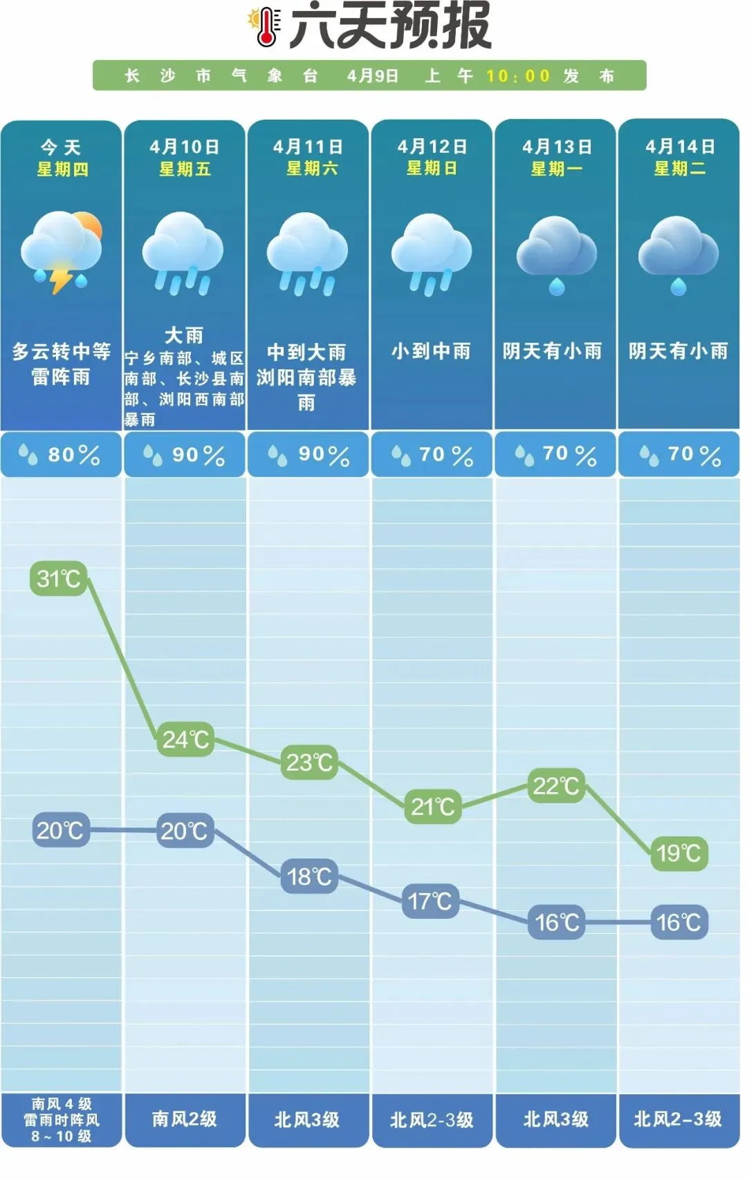 暴雨风险:10日湘中有中风险,长沙、株洲有较高风险。