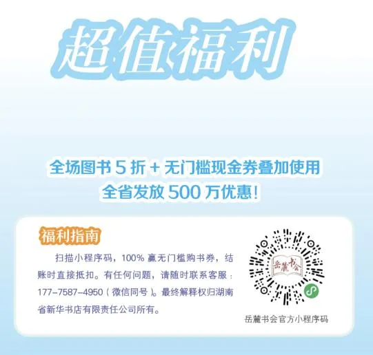 本届岳麓书会,湖南出版投资控股集团、中南出版传媒集团再次回馈读者,面向全省发放五百万优惠,推出“全场图书5折+无门槛现金优惠券”叠加使用的购书福利活动。读者扫码进入岳麓书会官方小程序,100%赢无门槛购书券。中南传媒旗下出版机构将在“麓山读书直播间”派发多重读者福利。