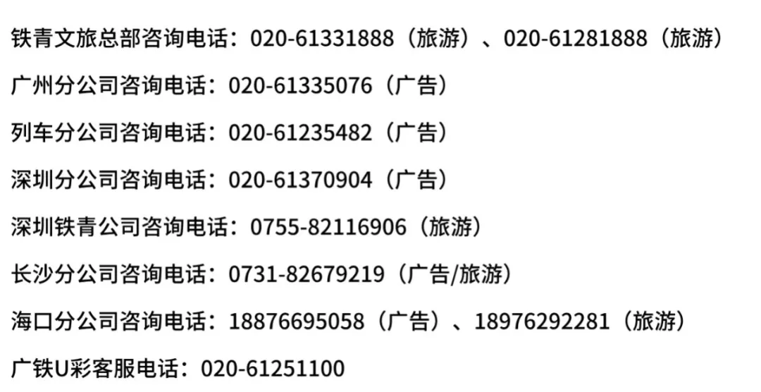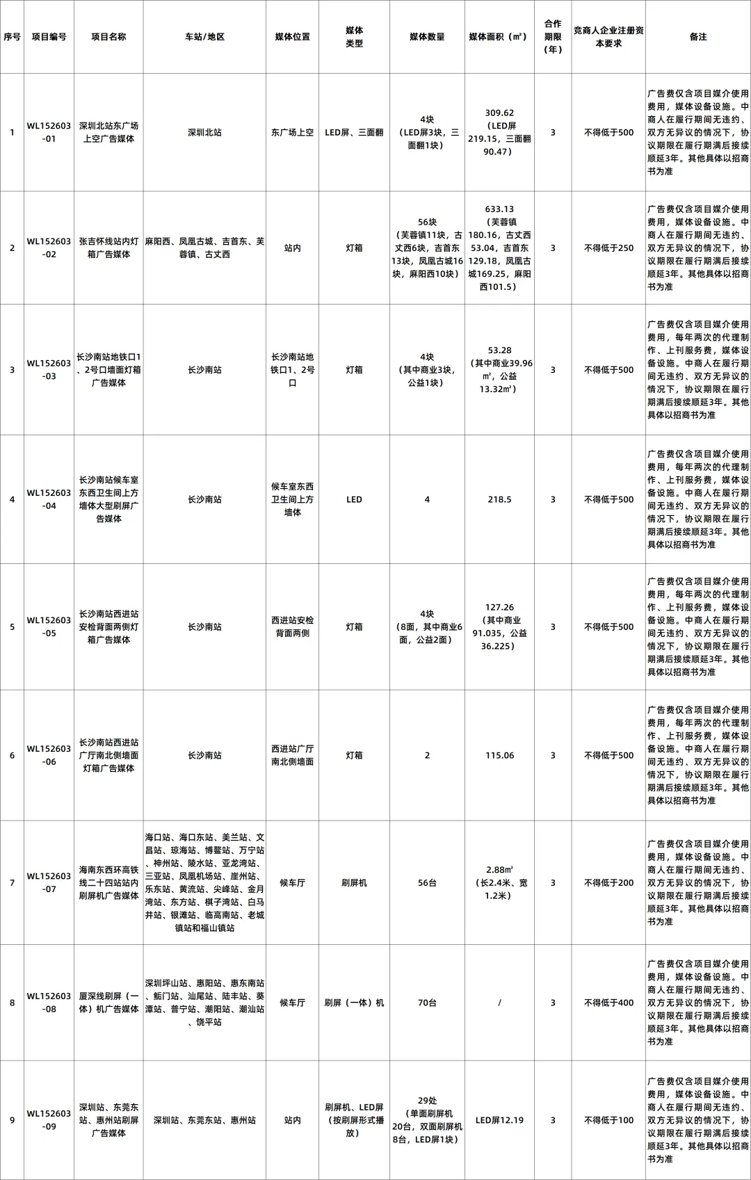 (2026-15号)长沙南站候车室东西卫生间上方墙体大型刷屏广告媒体、厦深线刷屏(一体)机等广告媒体招商广东铁青国际文化旅游集团有限公司主要负责国际国内游、旅游专列、票务代理、高铁商旅、停车场、汽车客运经营、共享汽车、湛海联程、酒店物业管理、铁路站车广告媒体资源开发、文化传播和印刷等业务规划、开发、经营和管理。