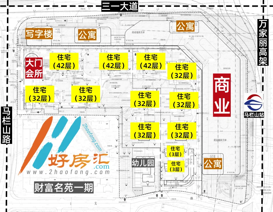 看区位,项目位于月湖公园南侧,最大优势北向可看一线湖景(部分楼栋),楼下就是5号线马栏山站地铁口。不过,缺点也非常明显:项目北侧、东侧被三一大道、万家丽高架合围,南侧是月大市场,都是车流量很大的易拥堵重灾区,会有非常大的交通拥堵、噪音干扰。另外需要注意的是:项目靠三一大道、万家丽高架两侧,还规划了1座大型商业、3栋公寓楼、1栋酒店办公楼。但在目前,这样的巨量商业几乎没有哪家开发商能吃下,后期大概率也会“商改住”。在马栏山,这几年从恒大、绿地到新力、当代,新盘开发都比较曲折。但这里,毕竟有地铁、有产业、有公园,有人气,并不缺少买家。本次公示后,闲置多年的财富广场能否“重生”?好房汇将继续关注!