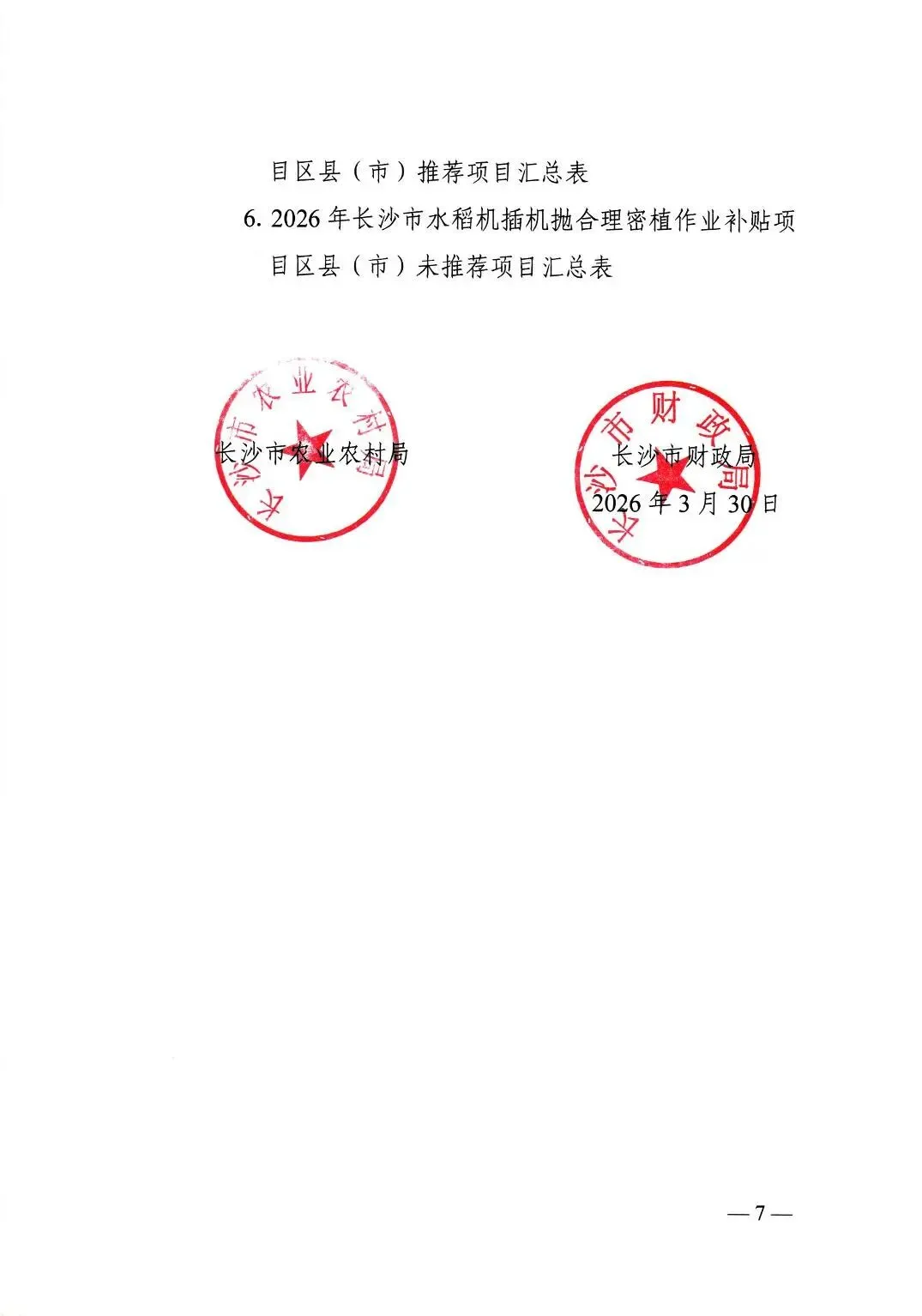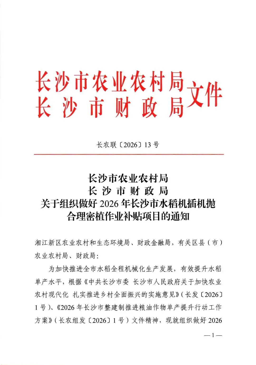 长沙市农业农村局 长沙市财政局 关于组织做好2026年水稻机插机抛合理密植作业补贴项目的通知