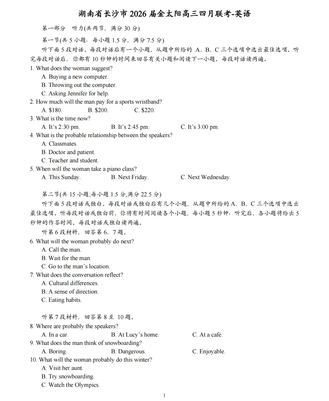 >2026湖南长沙高三金太阳4月联考