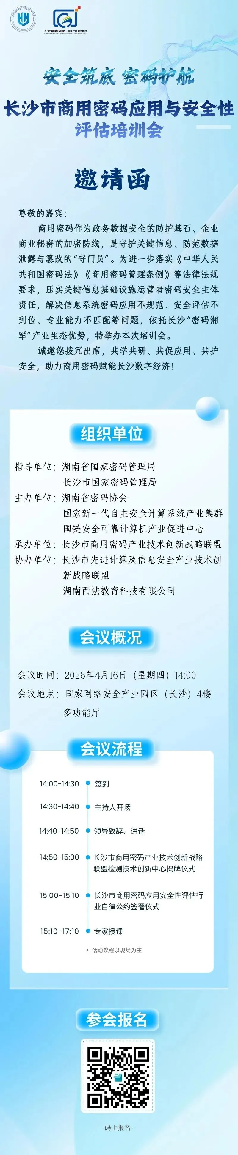 为深入贯彻落实《中华人民共和国密码法》《商用密码管理条例》等法律法规要求,全面强化关键信息基础设施密码安全保障能力,规范商用密码应用与安全性评估工作,依托长沙 “密码湘军” 产业生态优势,筑牢星城网络与信息安全防线,经湖南省国家密码管理局、长沙市国家密码管理局指导支持,国链安全可靠计算机产业促进中心、湖南省密码协会联合长沙市商用密码产业技术创新战略联盟等单位,拟于4 月 16 日下午 2 点在网络安全产业园区(长沙)1B 栋 4 楼多功能厅,共同举办 “安全筑底 密码护航 长沙市商用密码应用与安全性评估培训会”,诚邀大家扫码报名参会,您的到来将使活动更加精彩!长沙市国链安全可靠计算机产业促进中心