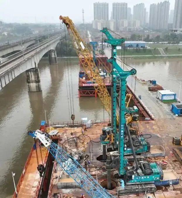 然而,大桥建设并非坦途。主桥位于直线上,左线中心与既有石长铁路二线中心水平间距仅约33.67米,施工组织难度与安全风险极高。尤其值得一提的是138#主桥墩——它位于湘江之中,覆盖层极浅,河床下仅有一层砂卵砾石层,以下全是坚硬的花岗岩层,相比另一侧的137#主墩,对施工精准度与工艺把控提出了更高标准。同时,湘江水域环保要求严苛,泥浆处理、噪音控制均提出较高要求。