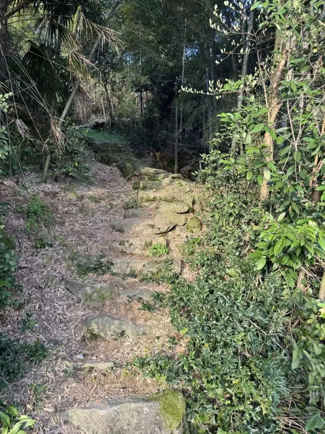 在山脚就看到了这几块巨石,位于半山腰,奇形怪状,如啸天狮子,后面才知这就是狮子岩。狮子岩后面有一个很大的空地,可以将车停在这里,搭帐篷赏日落。山间村民家的小径蜿蜒曲折,山林翠绿欲滴,竹海随风摇曳。踏上这条充满历史气息的石阶路,仿佛穿越时空,回到了古代。