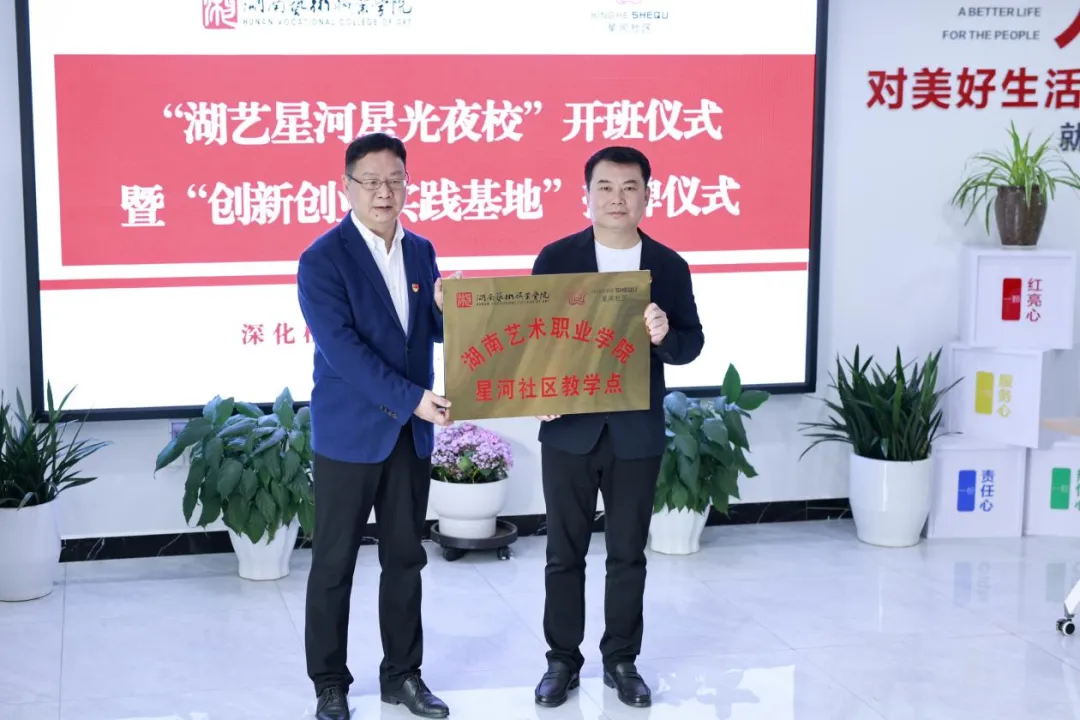 4月8日,湖南艺术职业学院与长沙星河社区合作共建授牌仪式在长沙市黎托街道星河社区举行,湖艺星河星光夜校、大学生创新创业实践基地正式挂牌成立。学校党委书记李越胜,党委委员、副校长石洋出席仪式。学校艺术培训部、招生就业与创新创业指导处、三馆管理中心等职能部门负责人,以及黎托街道、星河社区党政负责人、学员代表一同参加授牌仪式,共同见证校地合作的重要时刻。