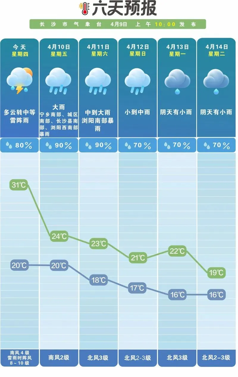 具体来看,10日长沙大雨,宁乡南部、城区南部、长沙县南部、浏阳西南部暴雨,南风2级,20℃至24℃;11日长沙中到大雨,浏阳南部暴雨,北风3级,18℃至23℃;12日长沙小到中雨,北风2到3级,17℃至21℃。