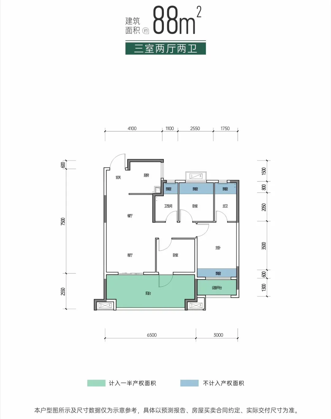 卓越朗宋:建面约88㎡户型,三房两厅两卫设计。