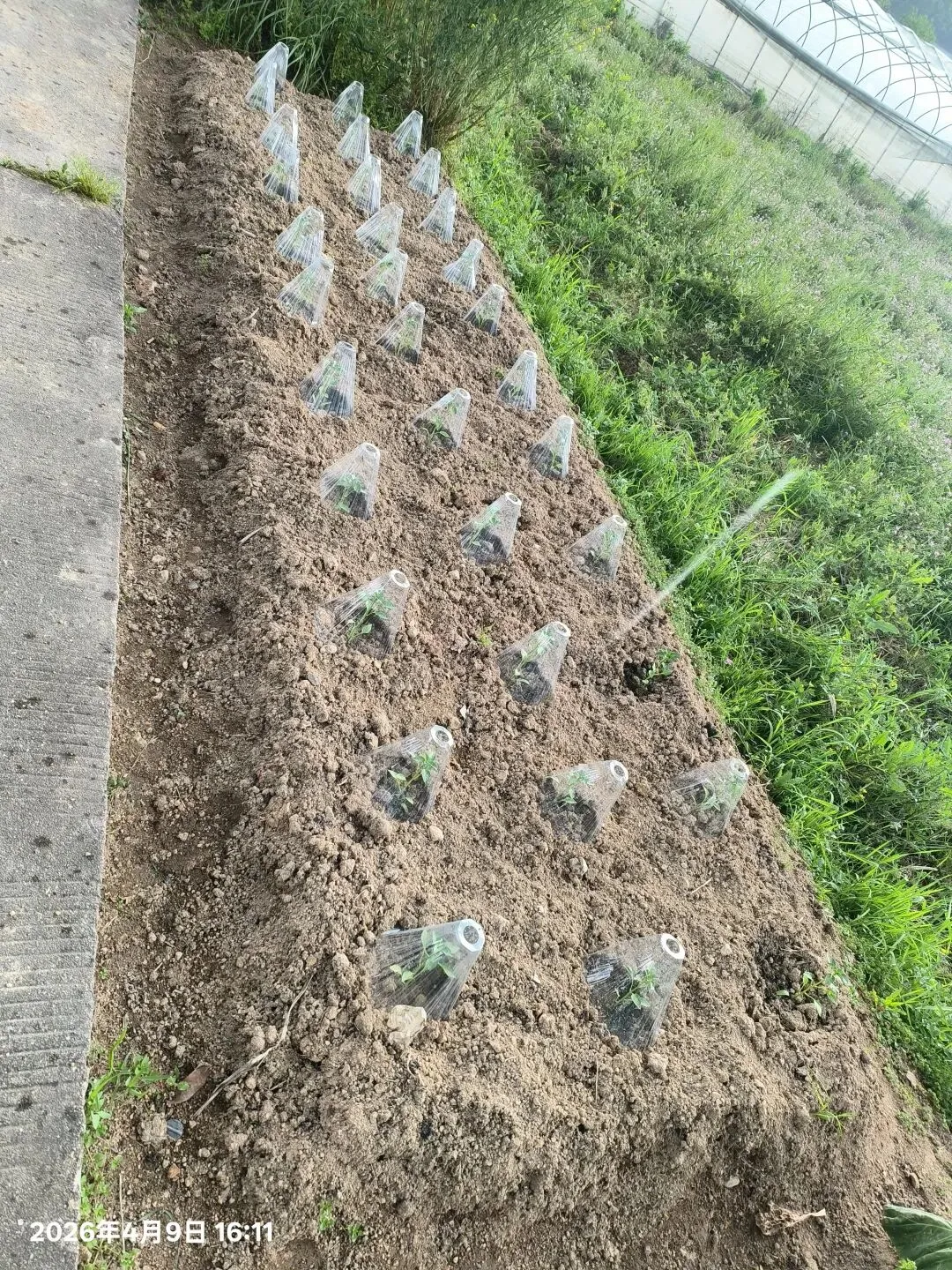 我又跑去看建哥种的辣椒苗,前两天栽下的秧苗整整齐齐,每一棵都套着上小下大的圆形塑料套,顶端还有透气孔,既能防风防雨,又能防止小动物破坏,等苗长大再取下,实在是巧妙。