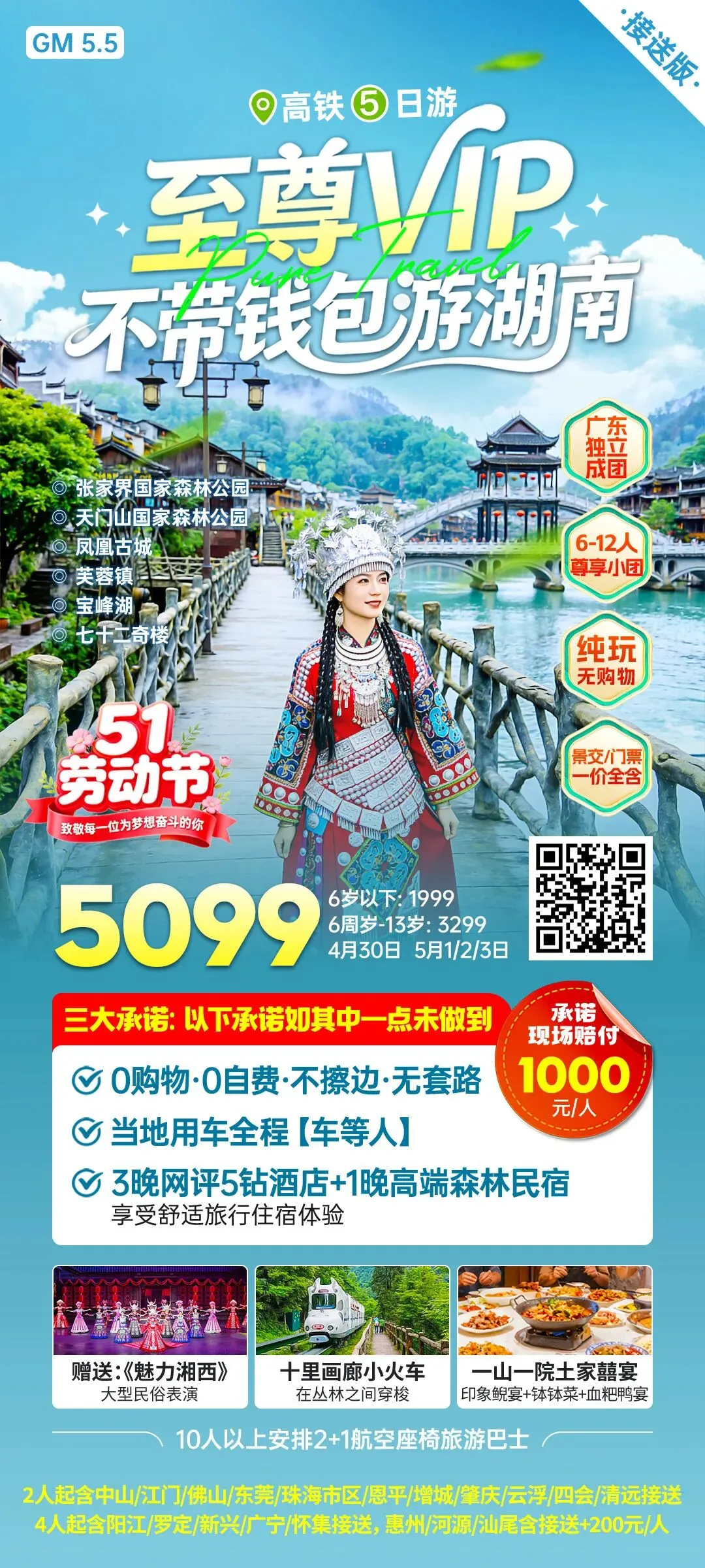 【至尊VIP 不带钱包游湖南】高铁5天
