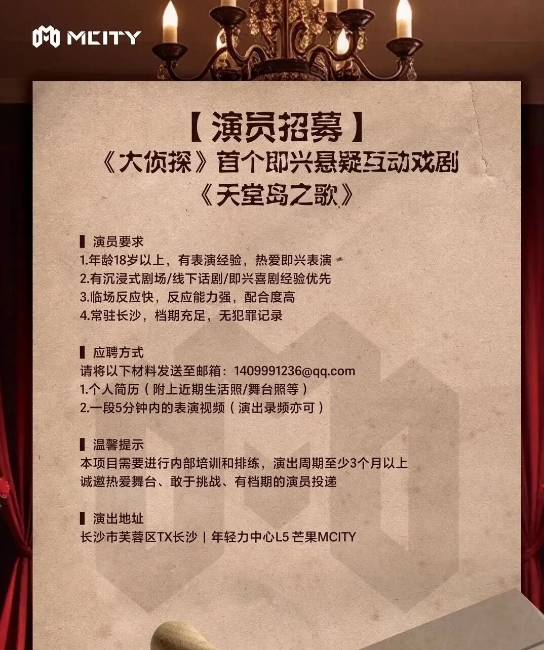 >【演员招募】长沙/《大侦探》首个即兴悬疑互动戏剧《天堂岛之歌》演员招募