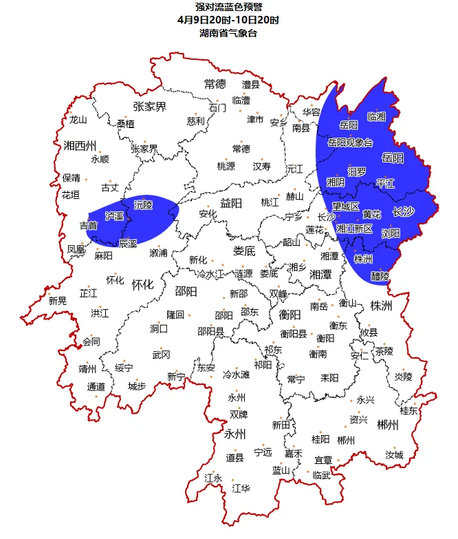 根据省气象局4月9日预报,省水利厅与省气象局联合会商得出如下结论:受降雨影响,9日20:00至10日20:00,株洲市、长沙市、湘潭市、岳阳市、常德市、益阳市、怀化市等局地可能发生山洪灾害。