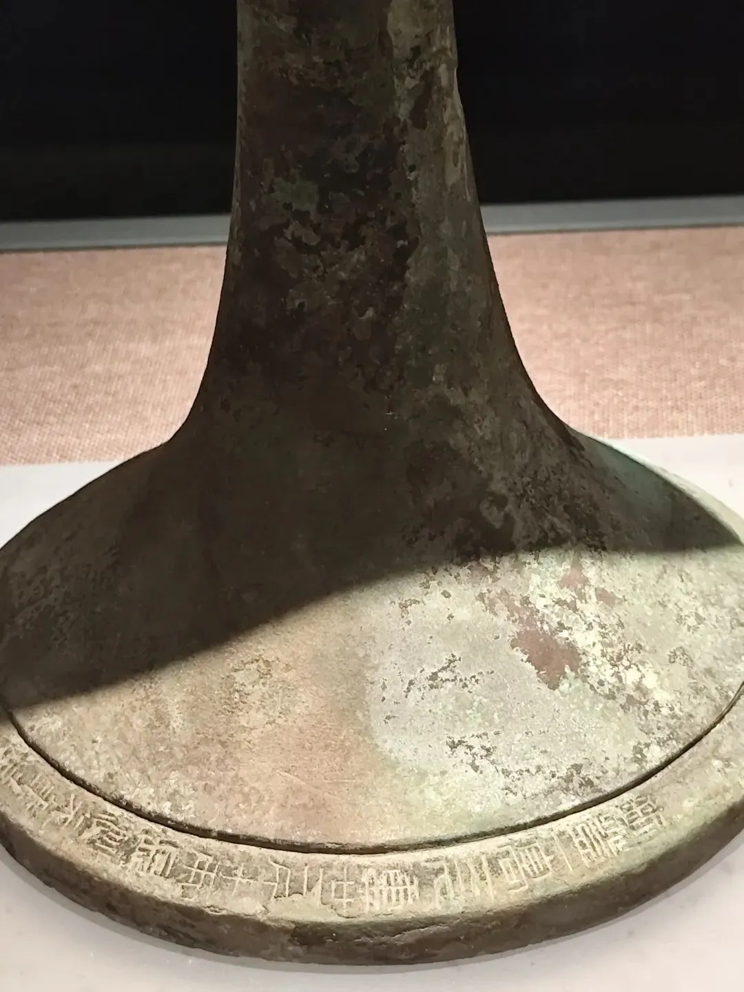 整体为豆形铜灯造型,直口浅腹灯盘,高柄搭配喇叭形圈足,器身铸工规整。圈足边缘刻有阴文篆书铭文,字体清晰、刀法稳健,铭文完整记录“铜灯 高二尺 重廿二斤七两 长沙元年造”,兼具实用与工艺标识属性,尽显西汉长沙国青铜铸造水准。