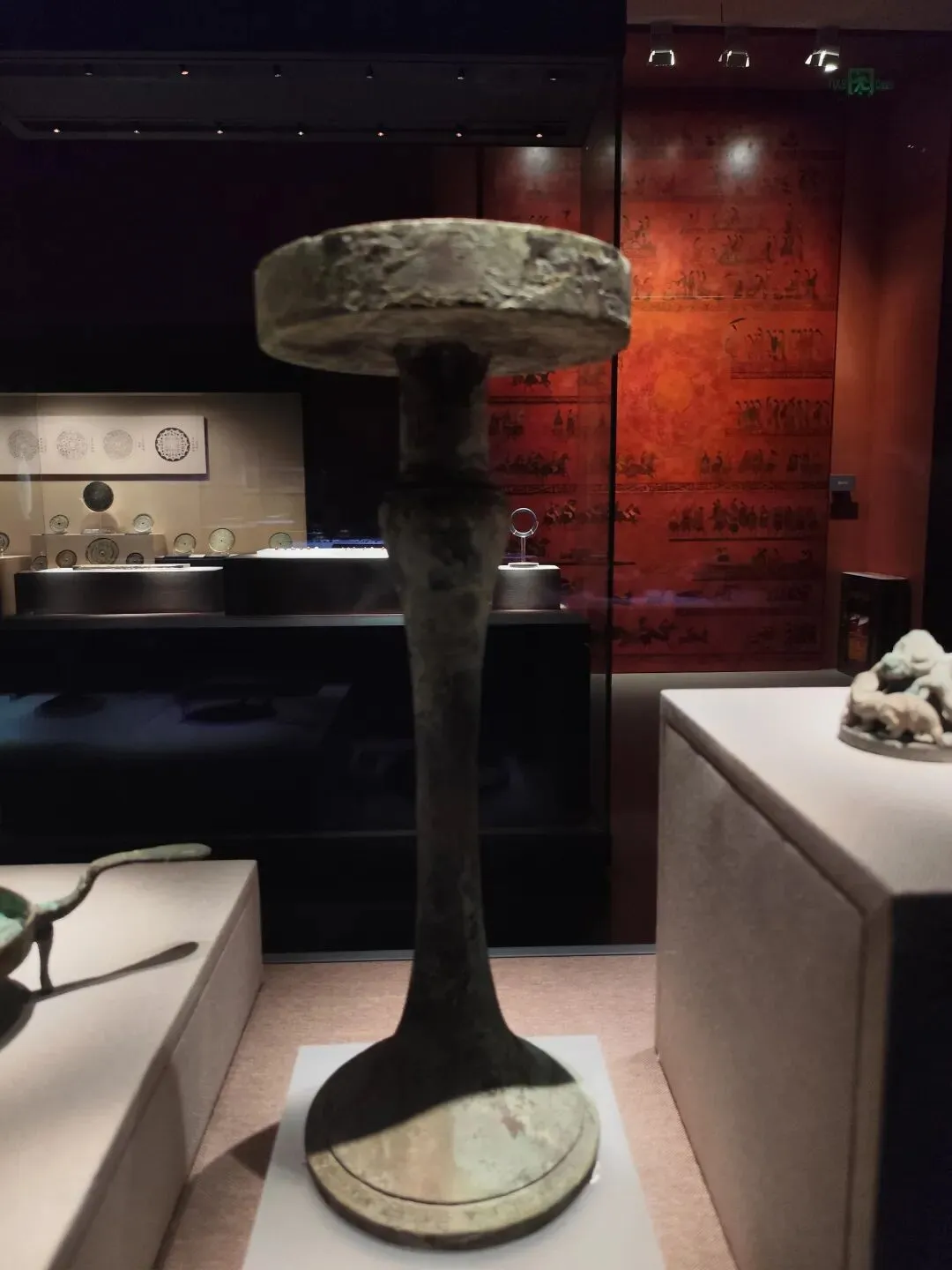 属于汉代典型的豆形行灯,灯盘可盛放灯油与灯芯,满足日常照明需求;高柄设计适配手持或案头摆放,兼顾出行与室内使用场景,是汉代贵族生活用具的代表性器物。