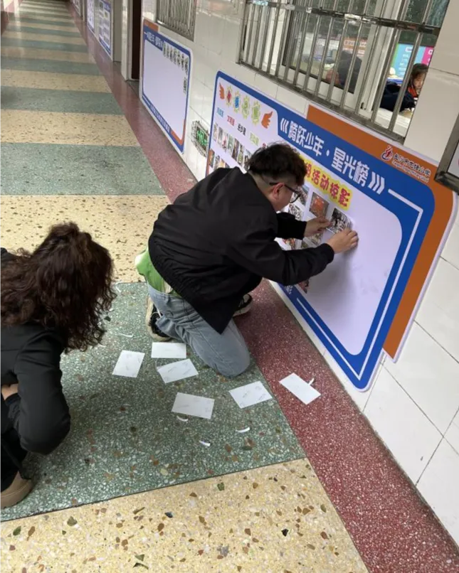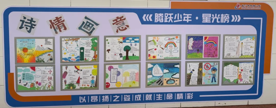 同日,一楼2204-2207、2504-2507共8个班级的外墙文化布置火热进行。一年级以 “彩虹色的花” 为主题,用绘画与手工打造出童趣满满的墙面;四年级则以自创儿童诗为核心,书写装点,尽显少年诗意与才情。