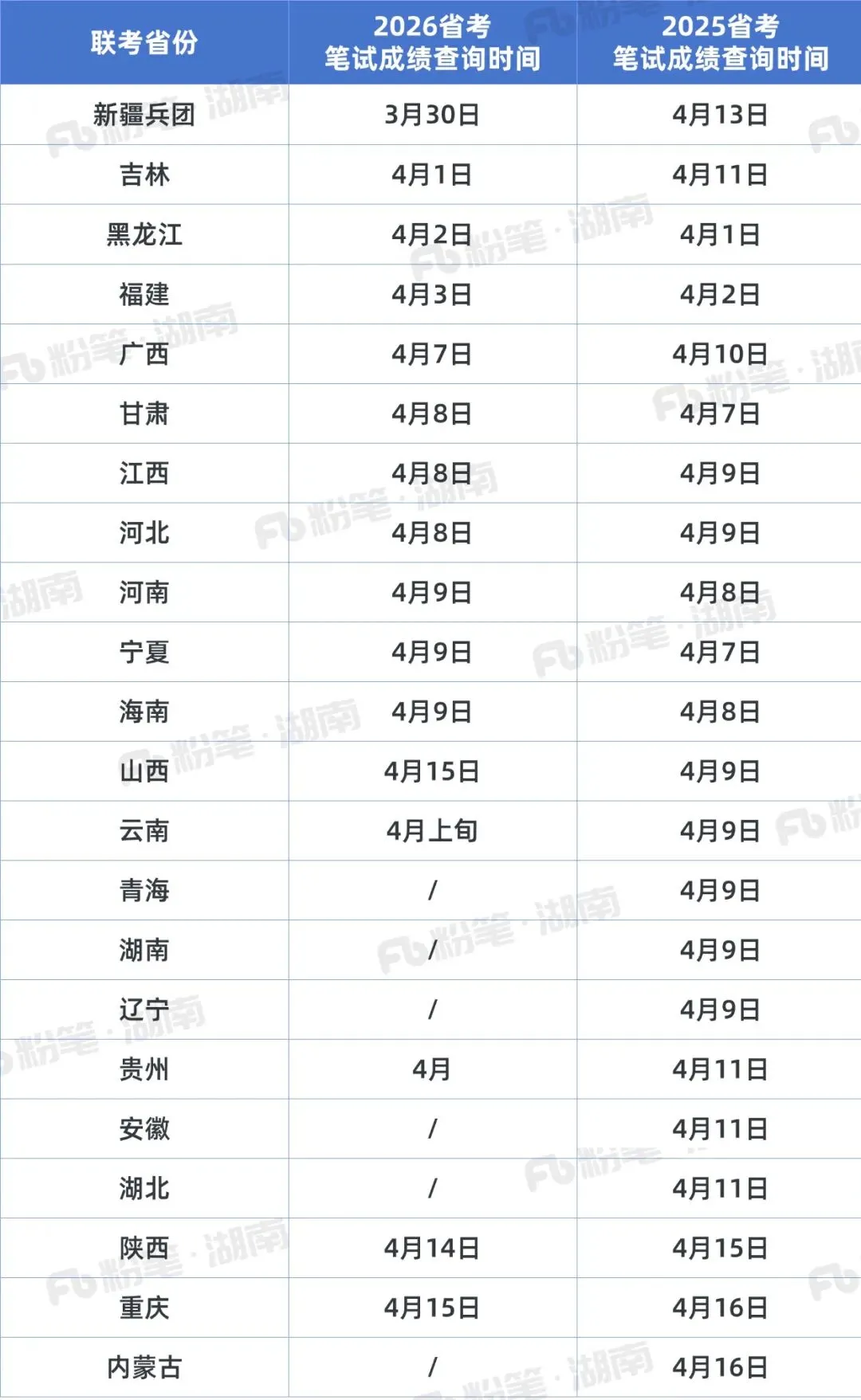 网上信息众说纷纭,大家看看就好,具体还是要等官方消息哦!和小粉笔一起看看其他已出成绩的联考省份,以及湖南与其他省份往年出成绩时间线对比吧👇