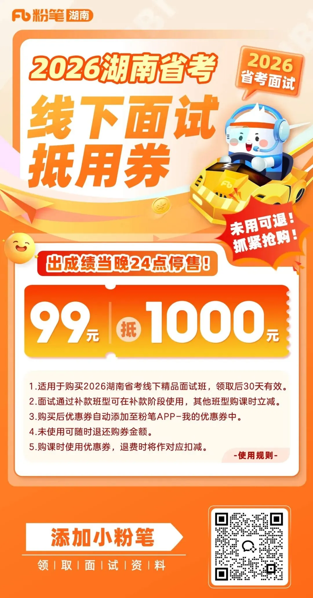 等待的同时,不妨囤囤粉笔【26湖南省考线下面试小班】大额优惠券,未用随时可退~💸
