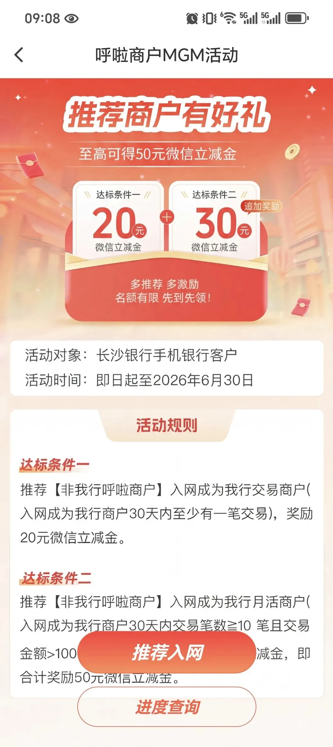 推荐非长沙银行呼啦商户入网成为我行交易商户,且该商户在入网30天内完成至少1笔有效交易,即可获得20元微信立减金。