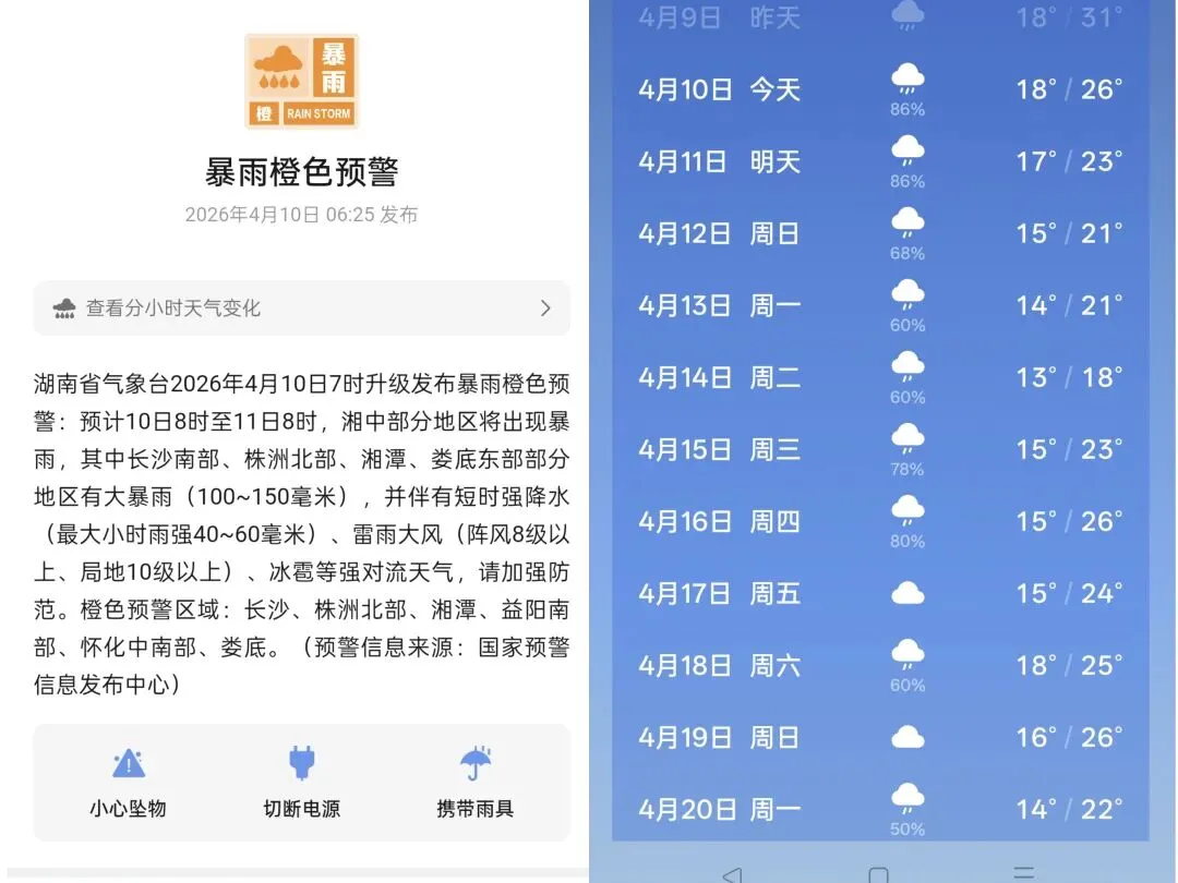 本以为要持续深陷酷暑之中,天气却猝不及防地骤变。今早,暴雨橙色预警直接刷屏,湖南省气象台重磅升级发布暴雨橙色预警,未来24小时强对流天气强势来袭,长沙全境被纳入预警范围,短时强降水、雷雨大风、局地冰雹一并来袭,城市内涝、高空坠物的风险骤然升高。