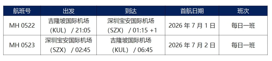 2026年7月2日开通深圳⇌吉隆坡每日航班