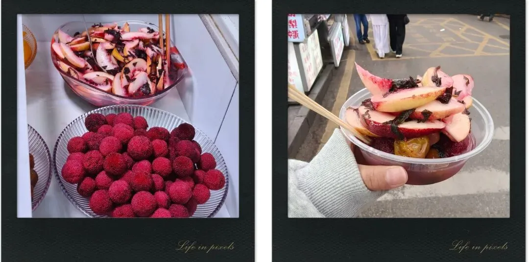 粉粉嫩嫩的桃子切片,裹着深紫的紫苏叶,泡在透亮的汤里,光是看着就忍不住咽口水。老板特别热情,看我们是远道而来的游客,直接把各种样式都让我们尝了一口。